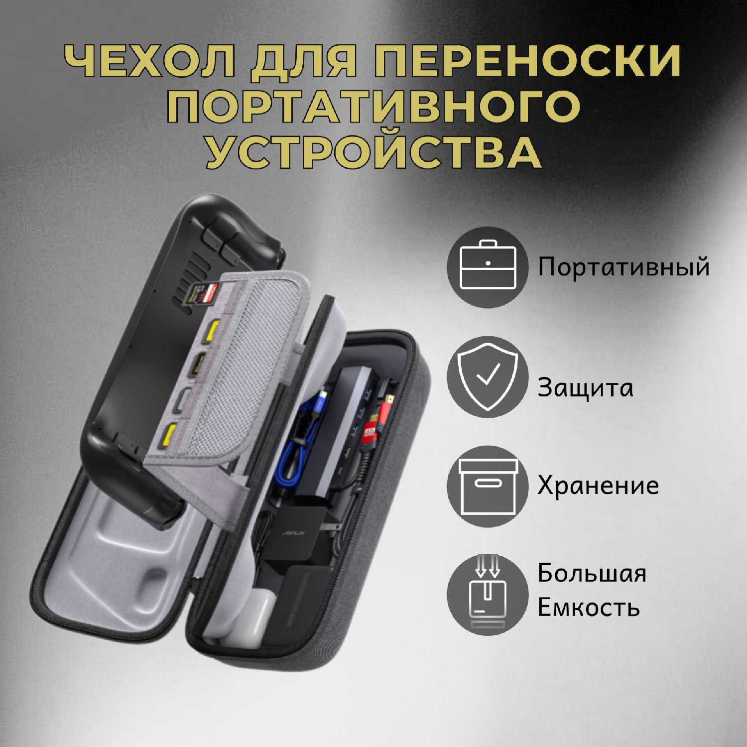 большой кейс для дальних поездок. в него умещается и зарядка и док станция и ещё остаётся свободное место)