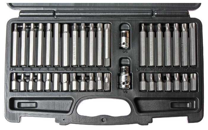 - + Удобный кейс, приятный, удобно располагается в руке, очень удобен при переносе, очень удобен на столе, биты сидят чётко, наличие бит как коротких так и удлинённых, гравировка с размером на каждой бите, в комплекте головки 1/2 и 3/8.