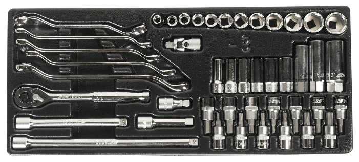| Головки торцевые подробно : | 3/8": 8 10 11 12 13 14 15 16 17 19 21 22 мм, длинные 3/8": 8 10 11 12 13 14 мм, свечные 3/8": 14 16 21 мм, с битами 3/8": H3 H4 H5 H6 H7 H8 T20 T25 T27 T30 T40 T45 T50, трещотка 3/8", карданный шарнир 3/8", удлинитель 3/8": 75 150 250 мм |