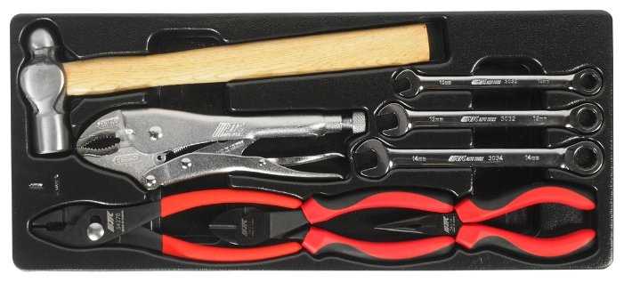 | Инструменты в комплекте : | бокорезы, вороток для головок, длинногубцы, клещи для снятия изоляции, клещи переставные, ключ переставной гаечный, ключ разводной, молоток, отвёртки, пассатижи, разрезные ключи-насадки, трещотка |