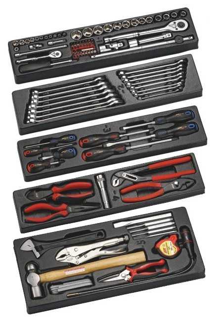 Инструменты в комплекте : | бокорезы, выколотка, длинногубцы, зубила, клещи, клещи переставные, ключ переставной гаечный, ключ разводной, молоток, отвёртки, трещотка |