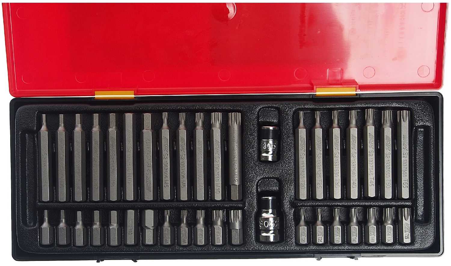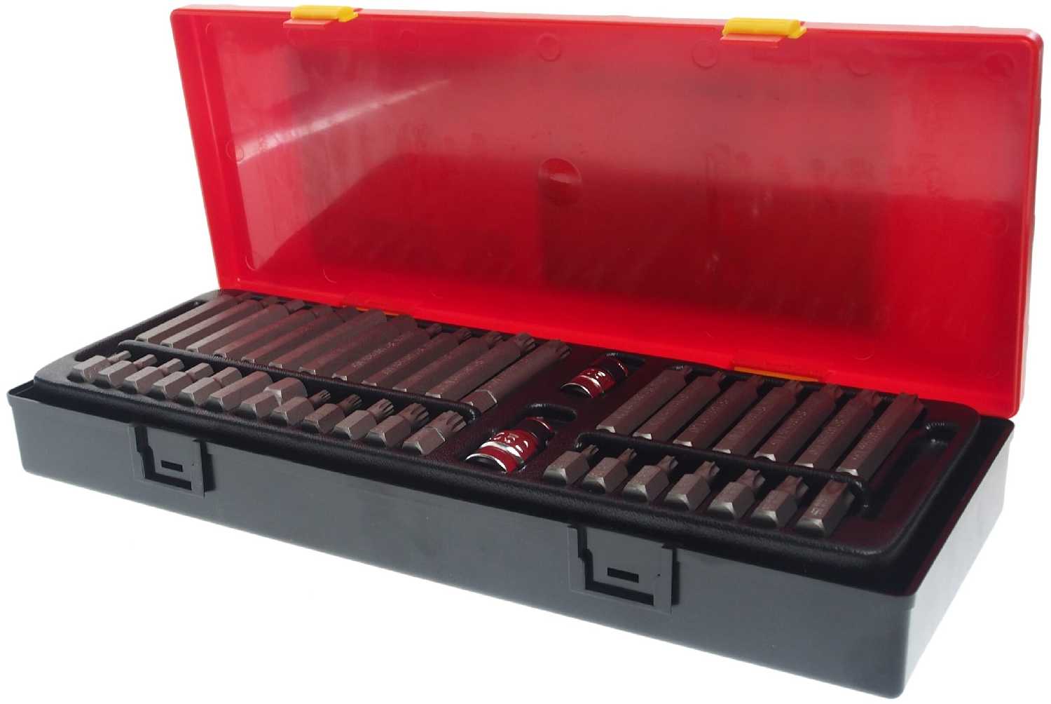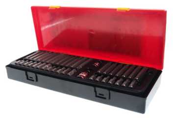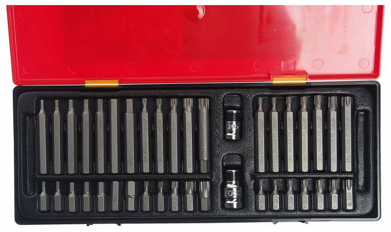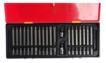 Биты подробно : | шестигранные биты HEX L30 мм 7 шт.: 4 5 6 7 8 10 12 мм, шестигранные биты HEX L75 мм 7 шт.: 4 5 6 7 8 10 12 мм, биты TORX L30 мм 7 шт.: T20 T25 T30 T40 T45 T50 T55, биты TORX L75 мм 7 шт.: T20 T25 T30 T40 T45 T50 T55, шлицевые биты SPLINE L30 мм 5 шт.: M5 M6 M8 M10 M12, шлицевые биты SPLINE L75 мм 5 шт.: M5 M6 M8 M10 M12 |