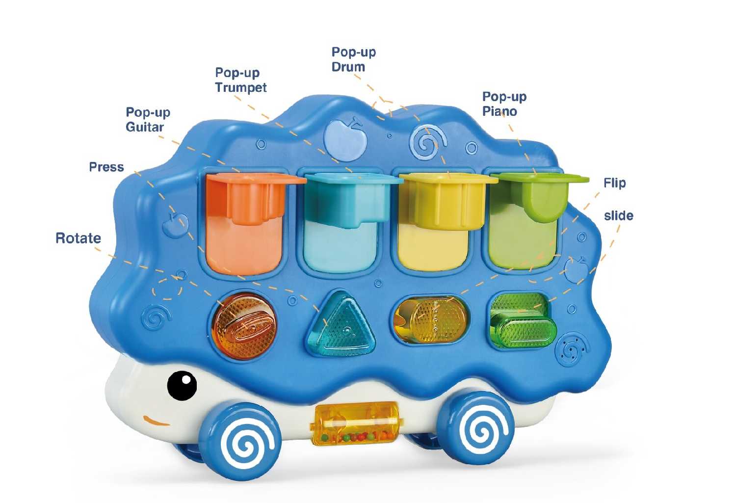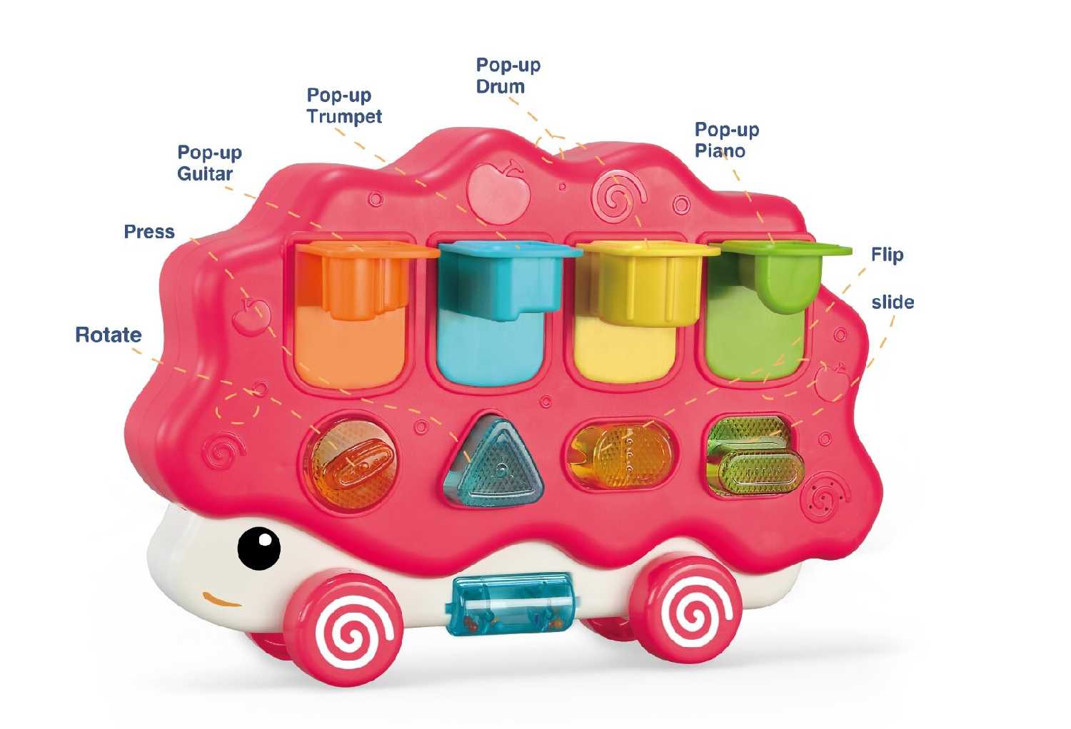 - + Отличная игрушка - можно катать, можно тренироваться нажимать кнопки и переключатели, можно делать все это с музыкальным сопровождением.