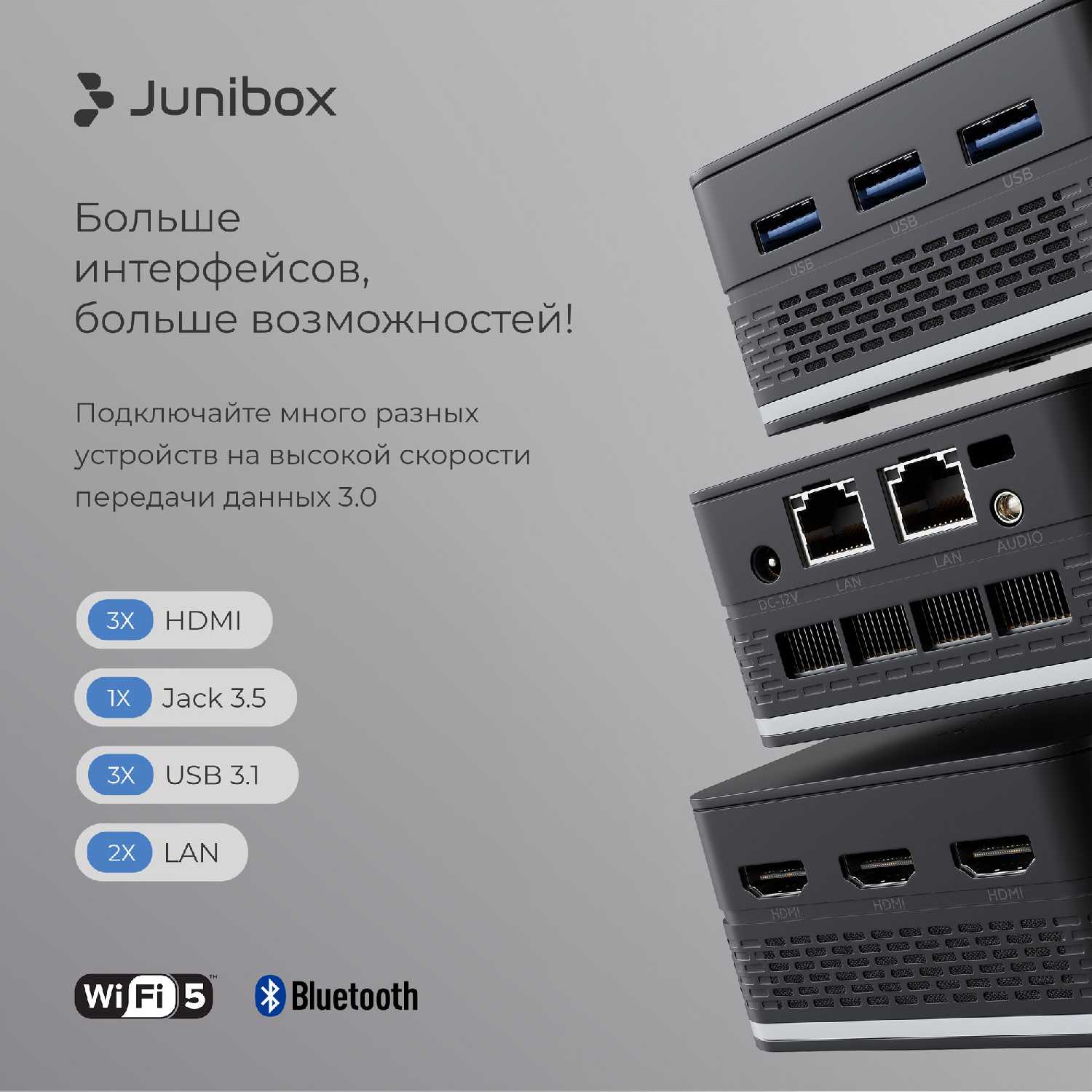 - Три HDMI для вывода на несколько мониторов (до 2K), три USB, WiFi и Bluetooth подключаются мгновенно.