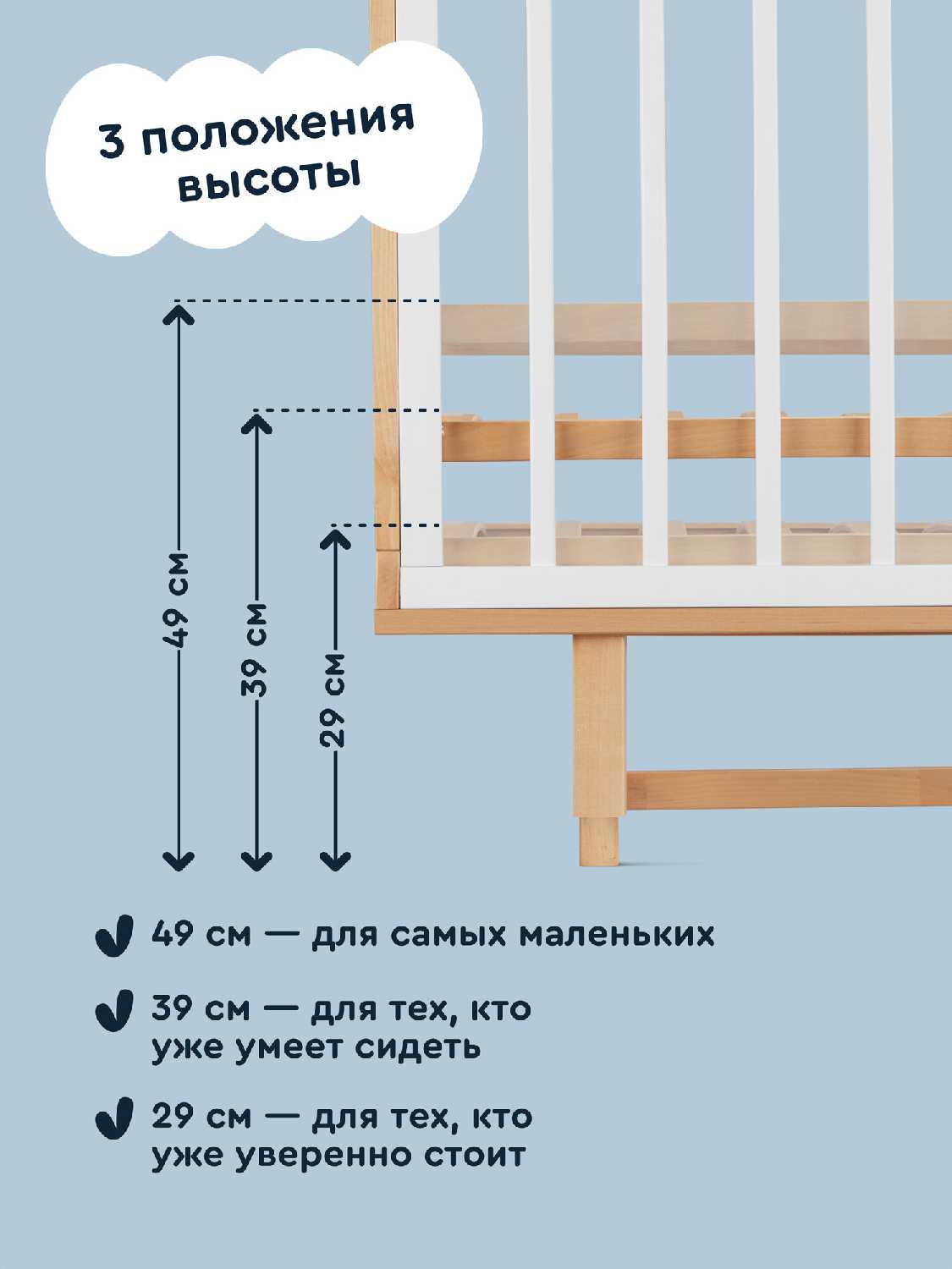 Эргономика и удобство использования Основной минус — неадаптированная высота бортов. При установке на маятник или колёса (даже с самым высоким положением дна) стенки остаются чрезмерно высокими для пользователей ростом 153-162 см, вынуждая их использовать подставки. Отсутствие силиконовых накладок на боковых бортах в расширенной конфигурации 120×60 см приводит к тому, что дети грызут незащищённое дерево. Регулировка дна имеет три уровня, но для новорождённых самый верхний всё равно недостаточно высок — требуется сильный наклон. Колёса со стопорами и войлочные накладки для защиты пола получили одобрение, но их преимущества нивелируются общими проблемами мобильности из-за габаритов.