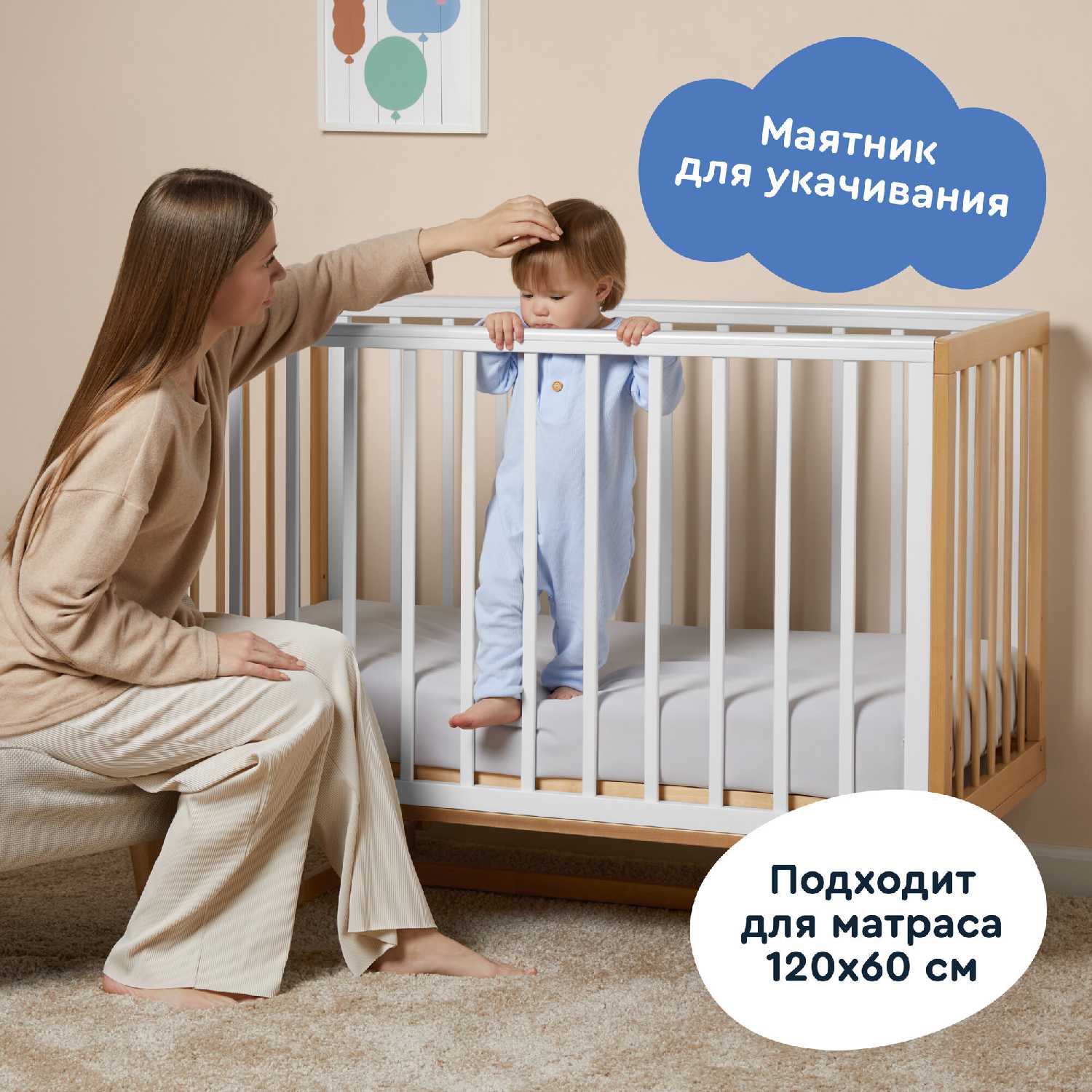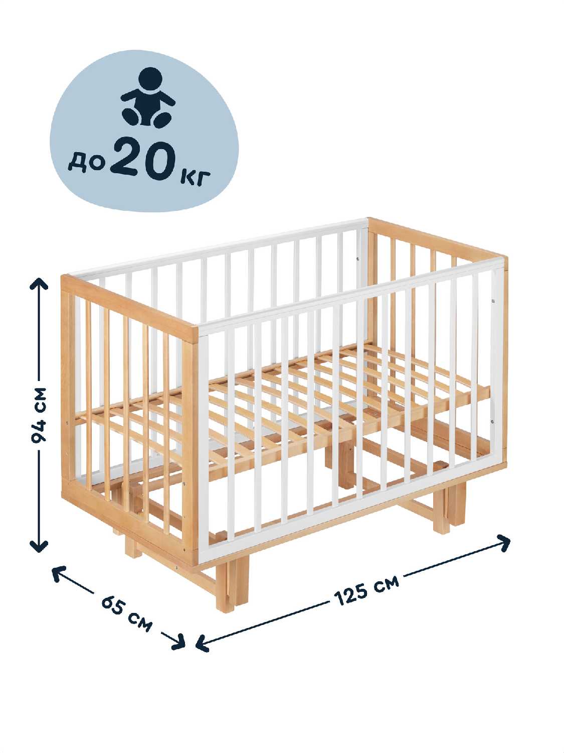 - Трансформация из компактной люльки в полноразмерную кроватку (90×120 см) за счет съемных элементов.
