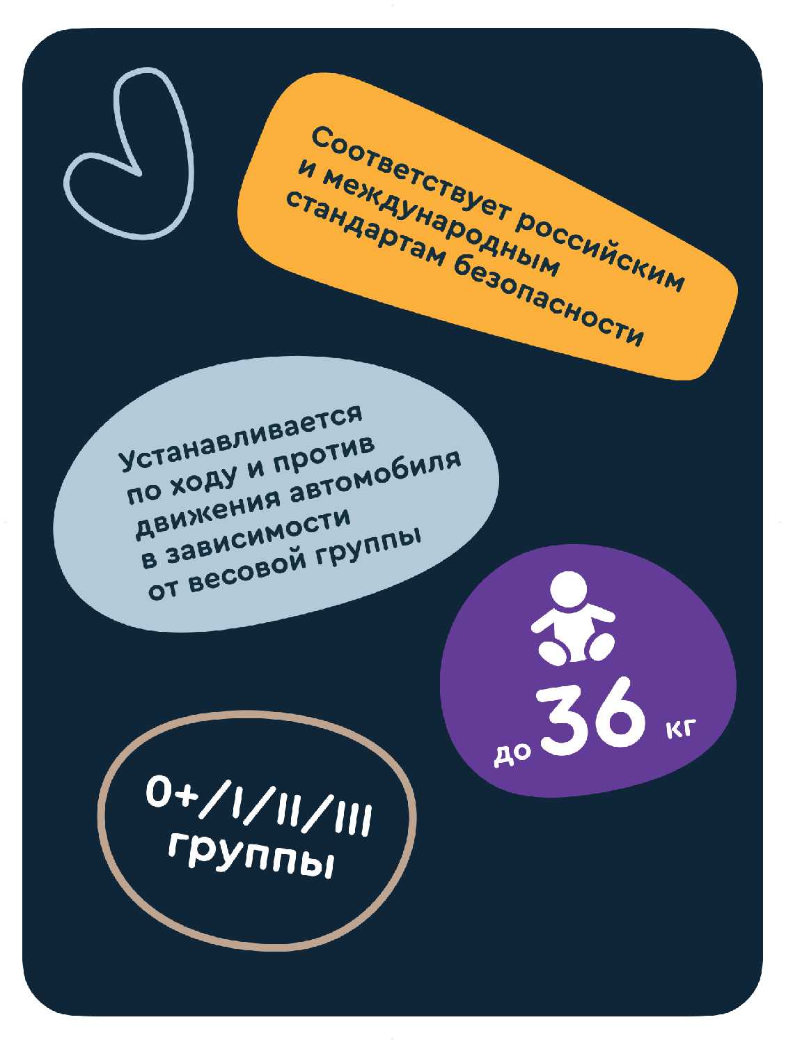 Безопасность. Пятиточечные ремни и боковая защита внушают доверие. Возможность установки как по ходу, так и против движения (в зависимости от весовой группы) — важный плюс.