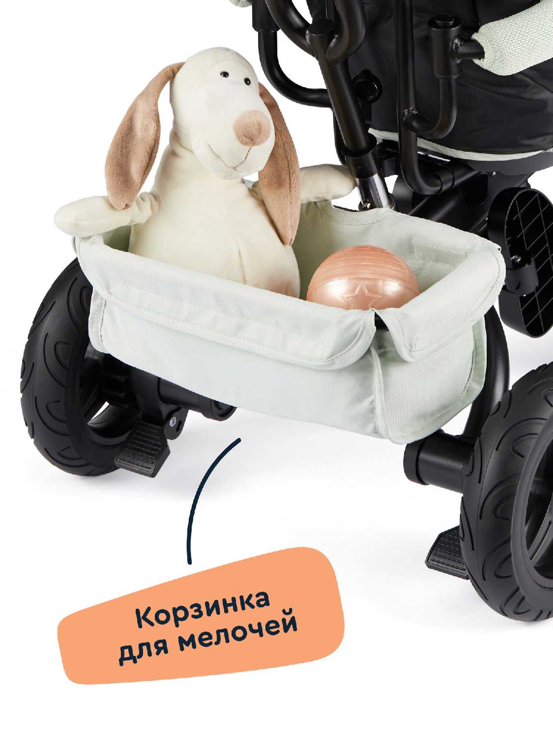 - Наличие корзинки для игрушек и кармана на ручке для мелочей (телефон, ключи) повышает удобство для родителей.
