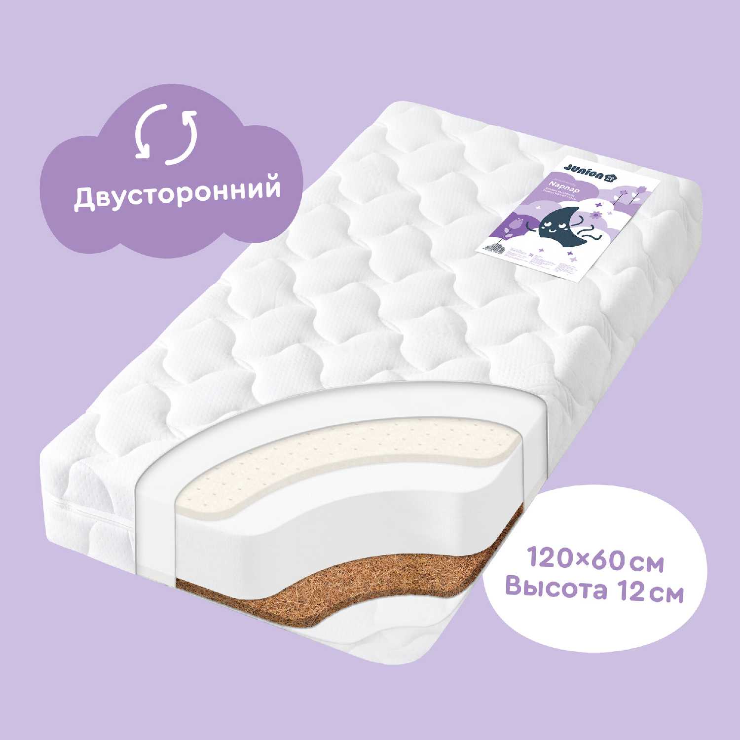 - Габариты 120x60 см (±1 см) обеспечивают идеальную посадку в кроватки серии Junior и аналоги без зазоров.
