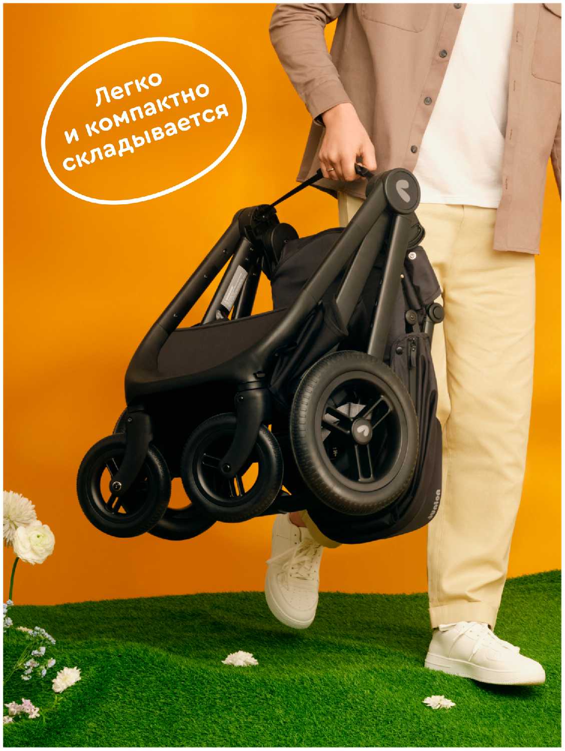 Шасси легко складывается двумя руками. Коляска очень маневренная, нижняя корзина для вещей подойдёт на любой случай.