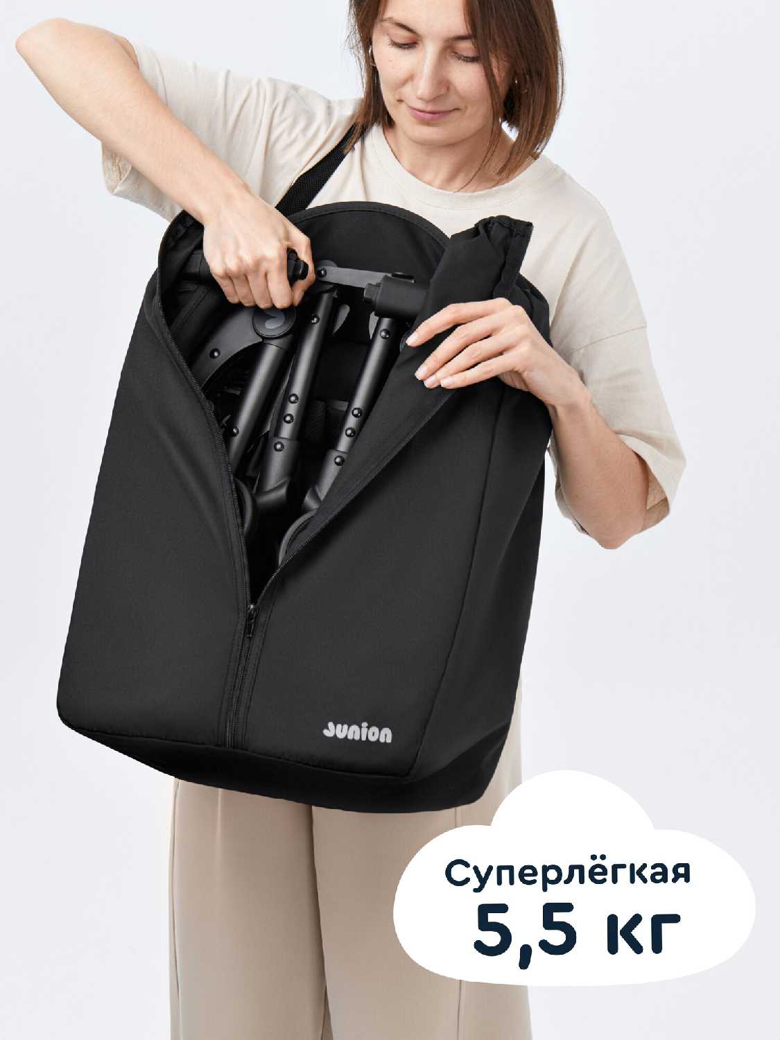 - Вес менее 5 кг позволяет переносить коляску одной рукой, а в комплектной сумке-чехле — перемещать её на плече.
