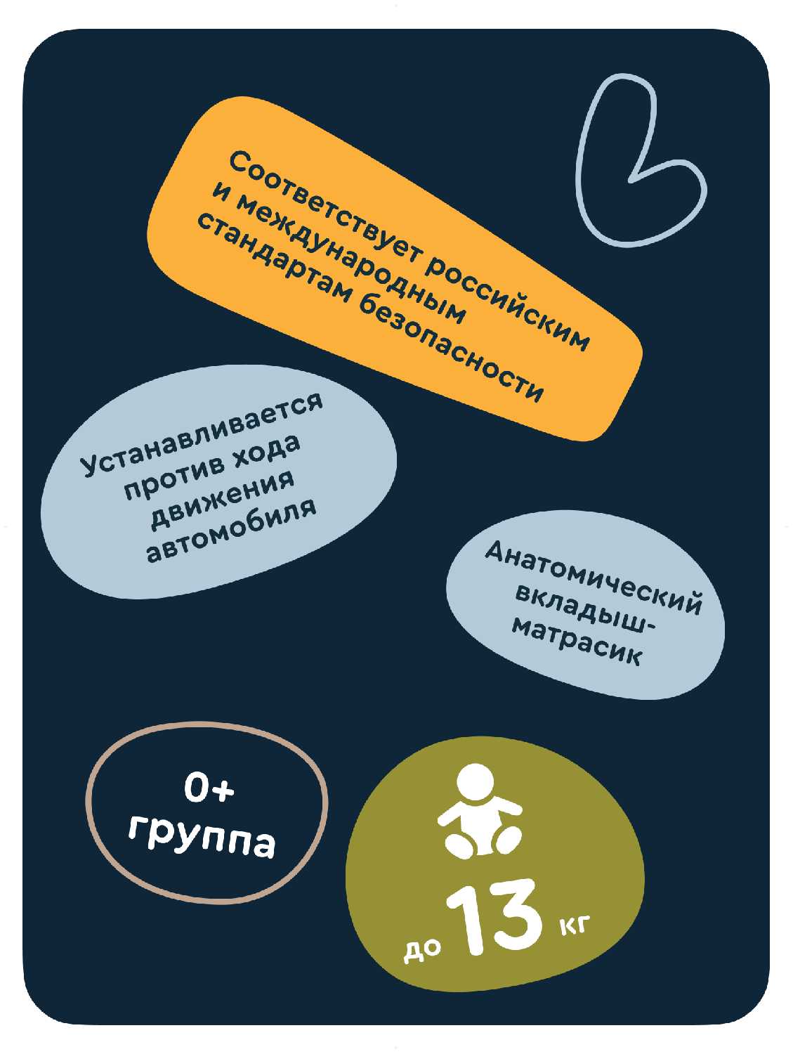 - Система пятиточечных ремней с усиленными пряжками и кнопкой центрального натяжения исключает смещение тела младенца даже при резких манёврах.