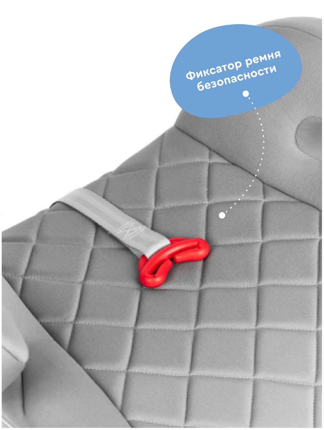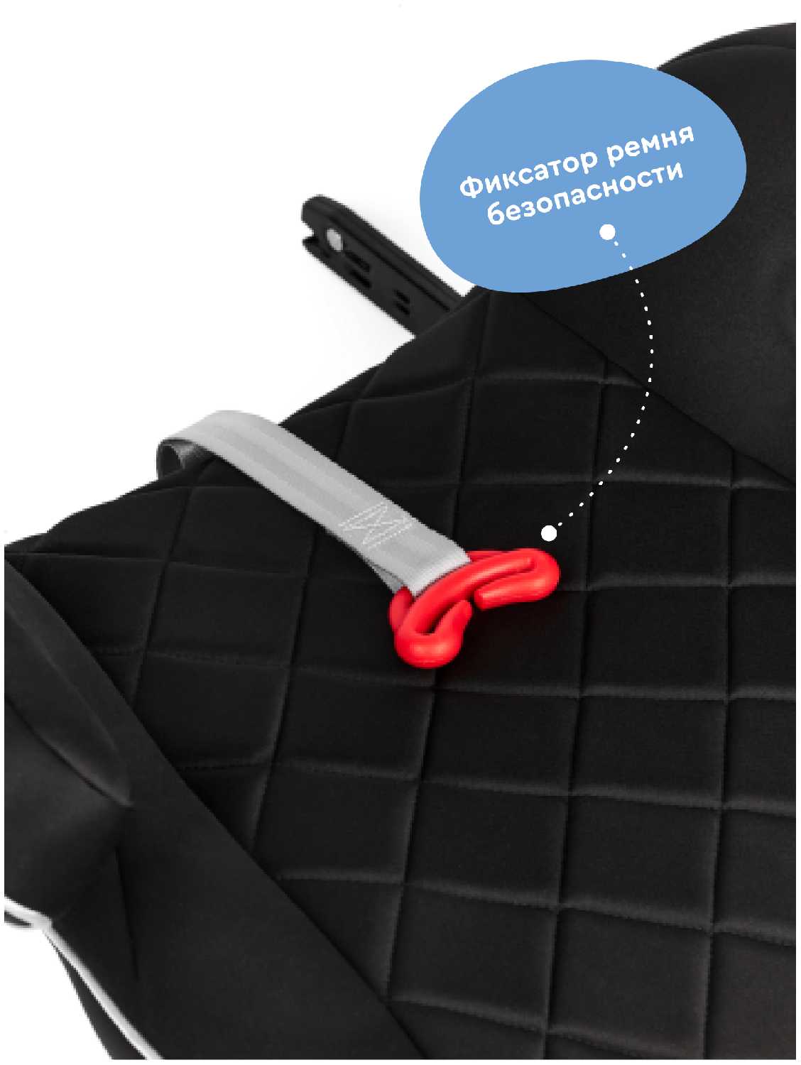 - Пластиковый фиксатор с силиконовыми вставками удерживает диагональную лямку ремня на расстоянии 10-12 см от шеи, исключая натирание.
