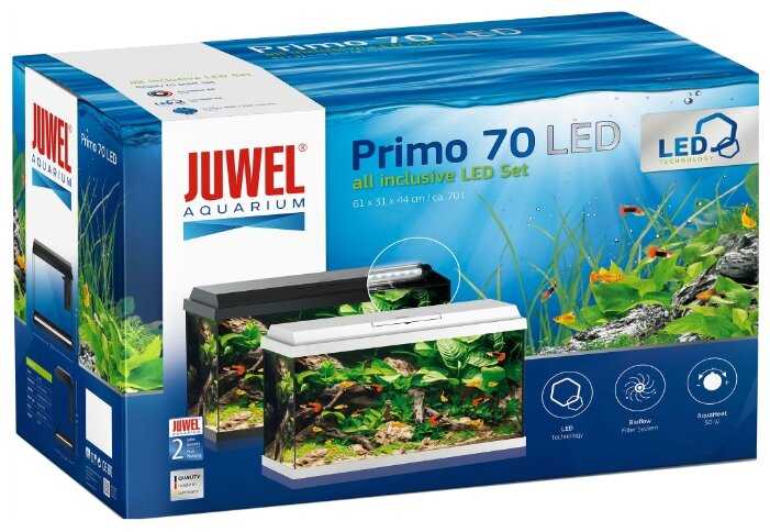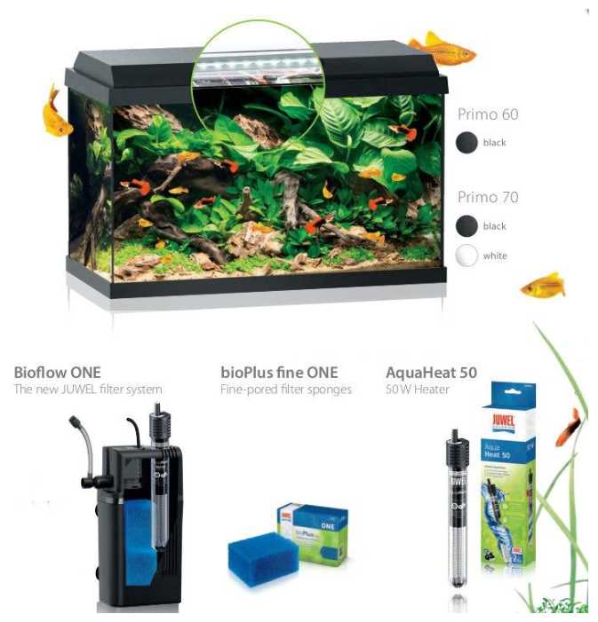 | Дополнительная информация : | фильтр Juwel Bioflow One c циркуляционным насосом Eccoflow производительностью 300 л/ч и мощностью 44 Вт и нагревателем Juwel AquaHeat 50 Вт с автоматическим терморегулятором, фильтр крепится на присосках, наполнитель фильтра — губки, крышка со светильником NovoLux 60 LED 8 Вт |