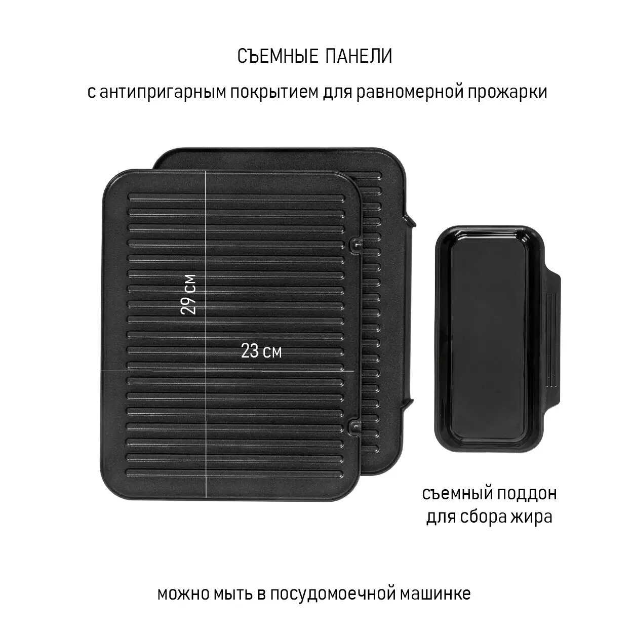 | Особенности : | антипригарное покрытие, поддон для сбора жира, регулировка высоты верхней панели, съемные пластины |