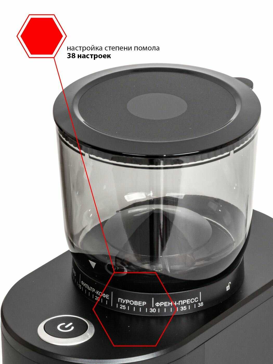 - + Отличная кофемолка для дома, жерновая, 38 вариантов помола на любого типа приготовления. Проста в управлении.