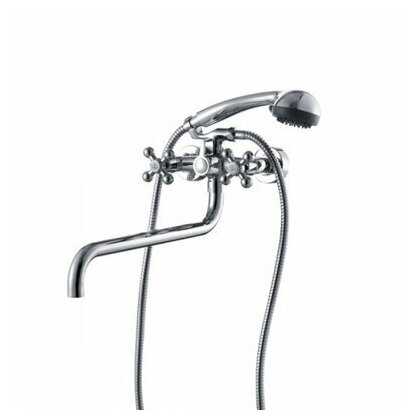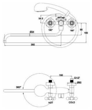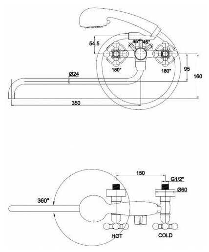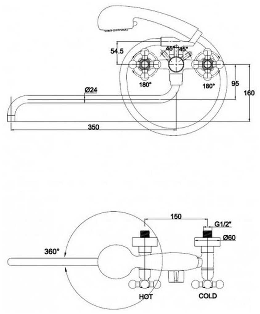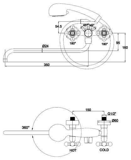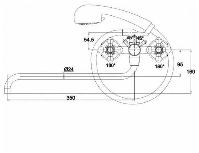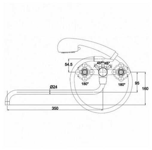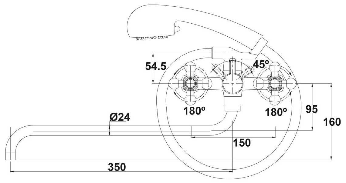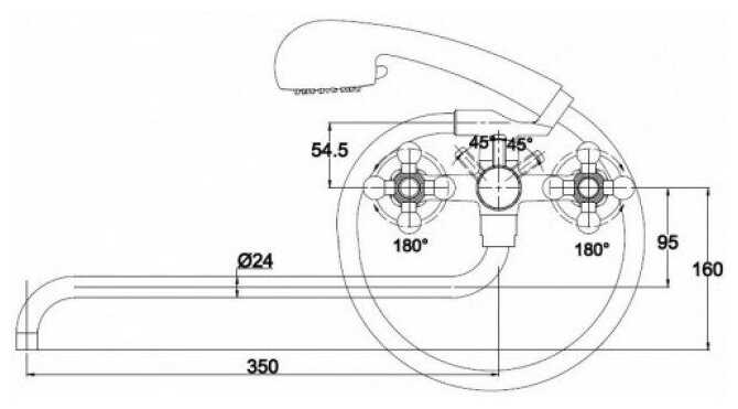2) Рукоятка переключения душа упирается в ручки кранов (поворачивается на 180°- вертикальное положение выключает воду; 90° налево от вертикали - душ, 90° направо- кран).