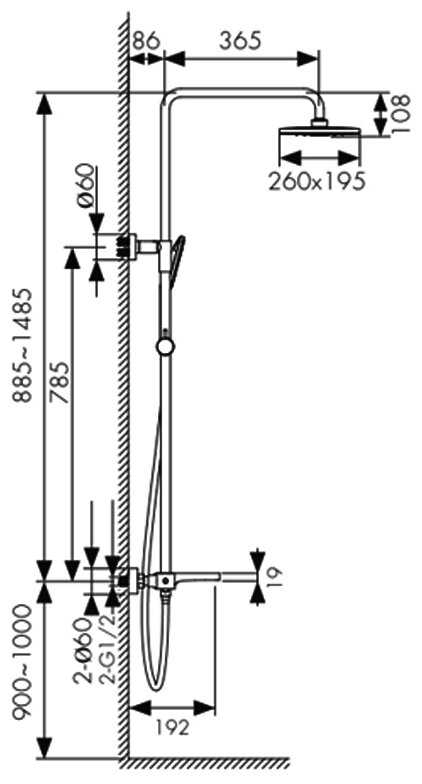 Высота стойки: от 885 до 1485 мм Размер верхнего душа: 260х195 мм