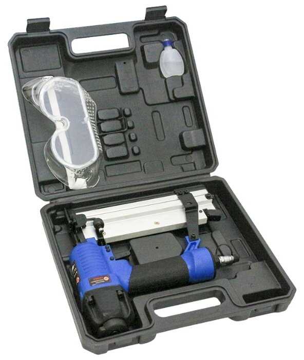| Комплектация : | нейлер, штуцер переходной 1/4'', маслёнка, очки защитные, ключ шестигранный, руководство по эксплуатации, кейс пластиковый |