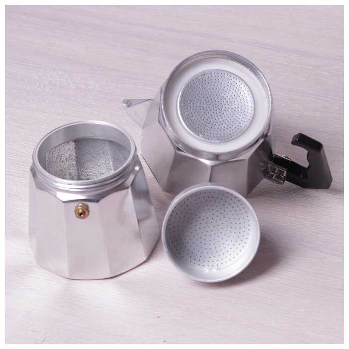 - + Очень хорошая кофеварка,достаточно толстый металл нижнего резервуара ,он не деформируется при нагреве,что часто наблюдается у более дешёвых.Отверстия в верхней сетке достаточно небольшие ,тем самым создаётся высокое давление и кофе заваривается очень крепким.В нижнем резервуаре остаётся совсем немного воды и выход кофе около 440 мл.Достойная вещь для кофемана.