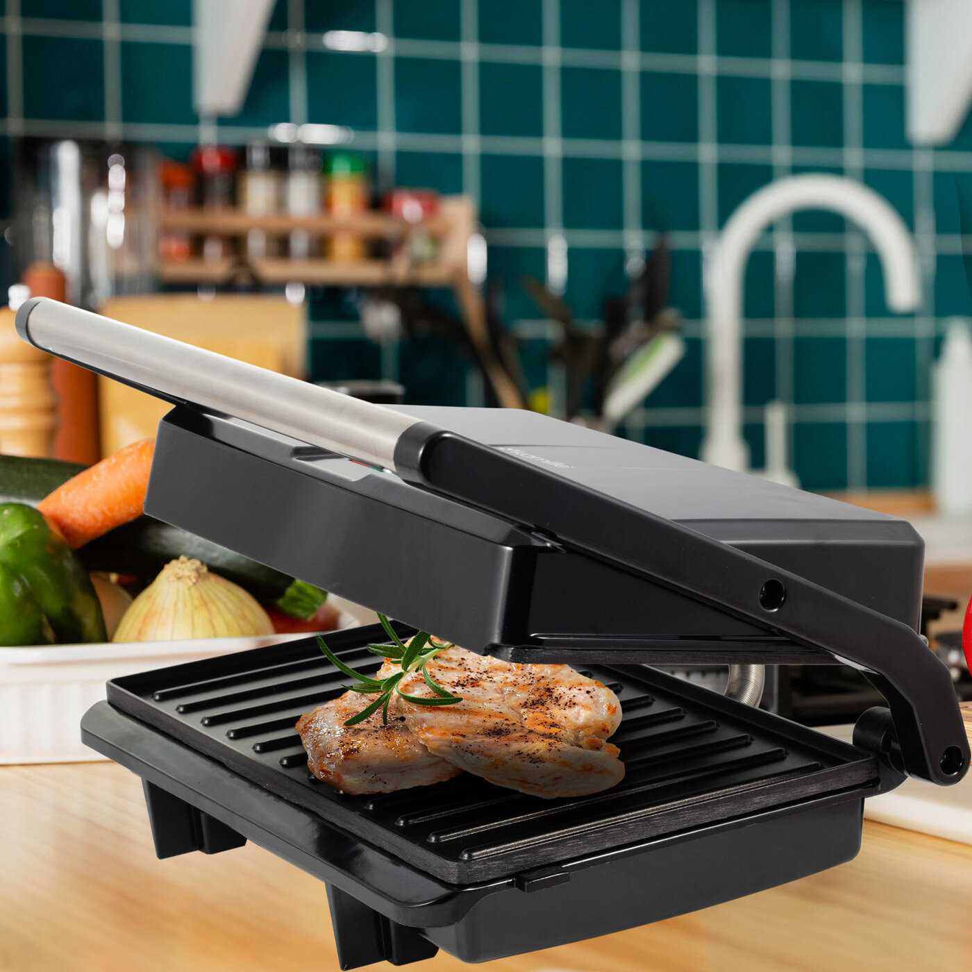 | Особенности : | антипригарное покрытие, контактный гриль, поддон для сбора жира, регулировка высоты верхней панели |