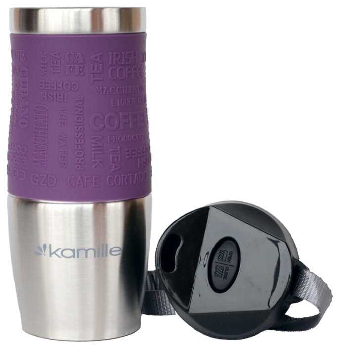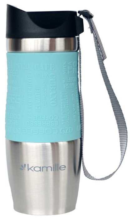 - + удобный дизайн- силиконовый держатель и крышка с кнопочный, ремешок. держит хорошо температуру напитка