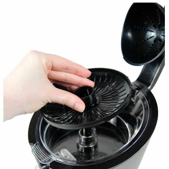 - + Отличная соковыжималка, достаточно внушительных размеров, но зато любой стакан или кружка подойдет по высоте