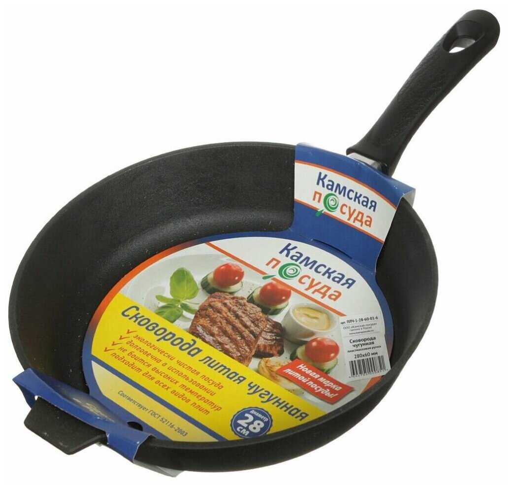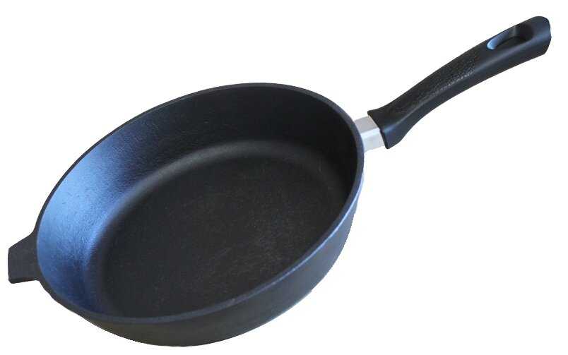 - + Отличная тяжёлая чугунка. Сменная ручка => духовка -- её любимое место :)