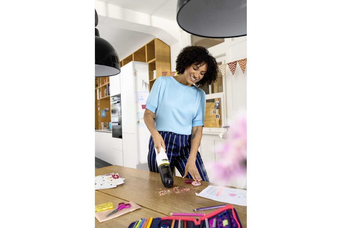 - Эргономичный вес (не указан, но подчеркивается "легкий") и форма корпуса позволяют удерживать пылесос одной рукой при чистке полок или мебели.