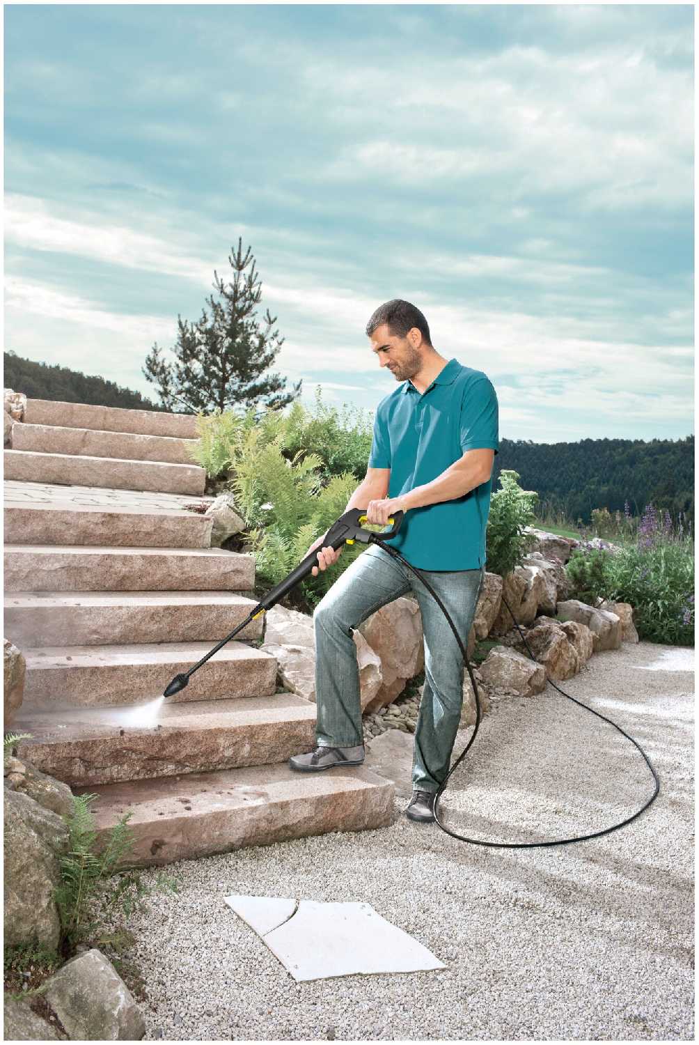 Да, это одна из сильных сторон модели. При работе с грязевой фрезой или веерной насадкой аппарат легко удаляет бетонный налет, мох и многолетние загрязнения с каменных поверхностей. Давление в 145 бар позволяет отмывать плиточные швы, садовый инвентарь и уличную мебель.