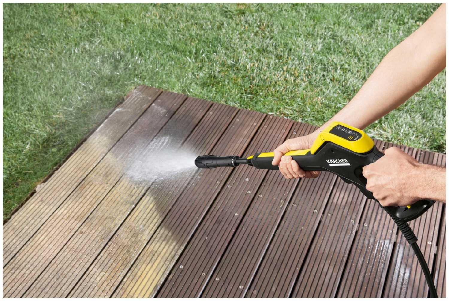 - Регулировка давления прямо на пистолете позволяет адаптировать мощность струи под разные задачи: от деликатной мойки авто до очистки бетонных дорожек.
