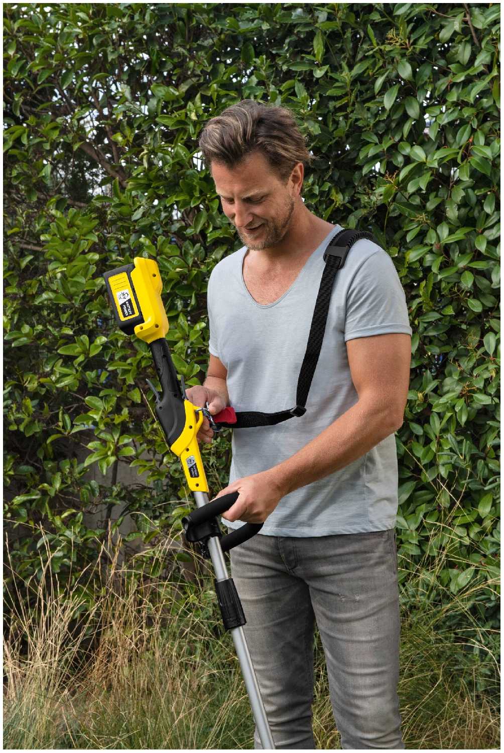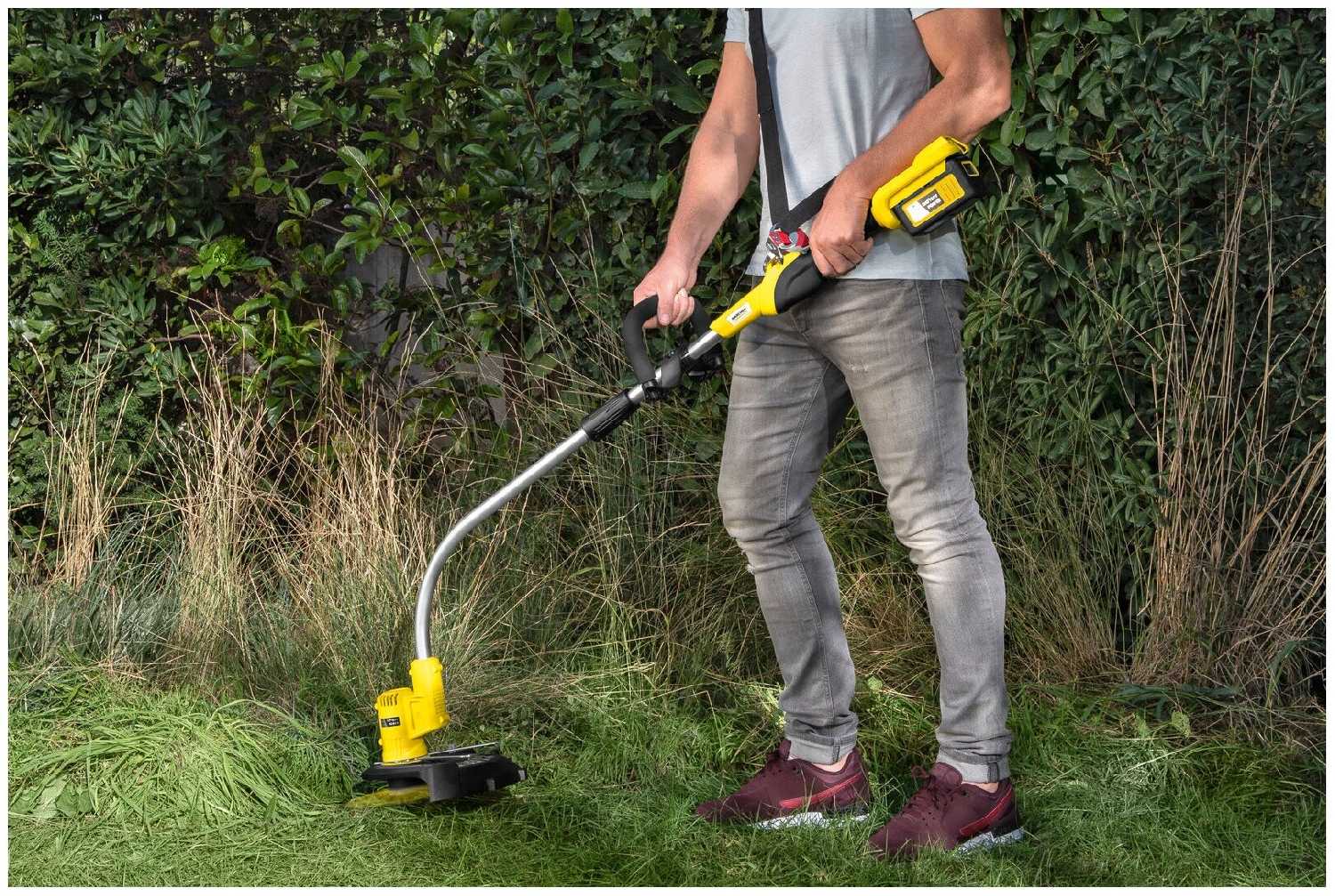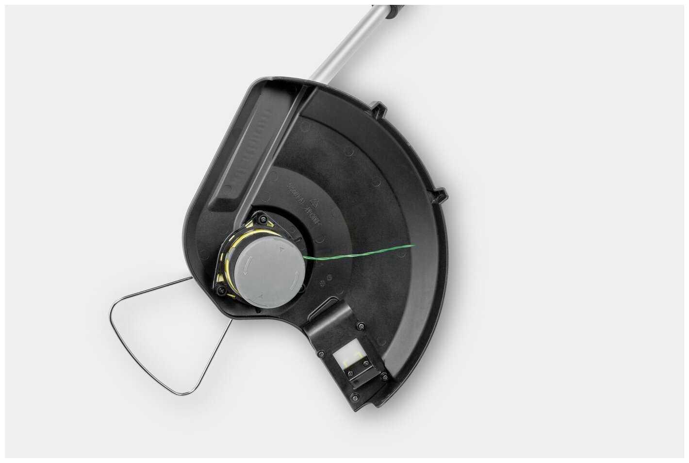 Весит триммер Керхер не сильно много, работать им удобно, не устаешь. А за счет плечевого ремня вес распределяется равномерно и его вообще не ощущаешь при работе. Работает намного тише, чем бензиновые модели, ну и выхлопов никаких нет в процессе эксплуатации.
