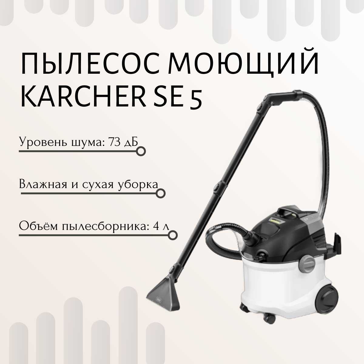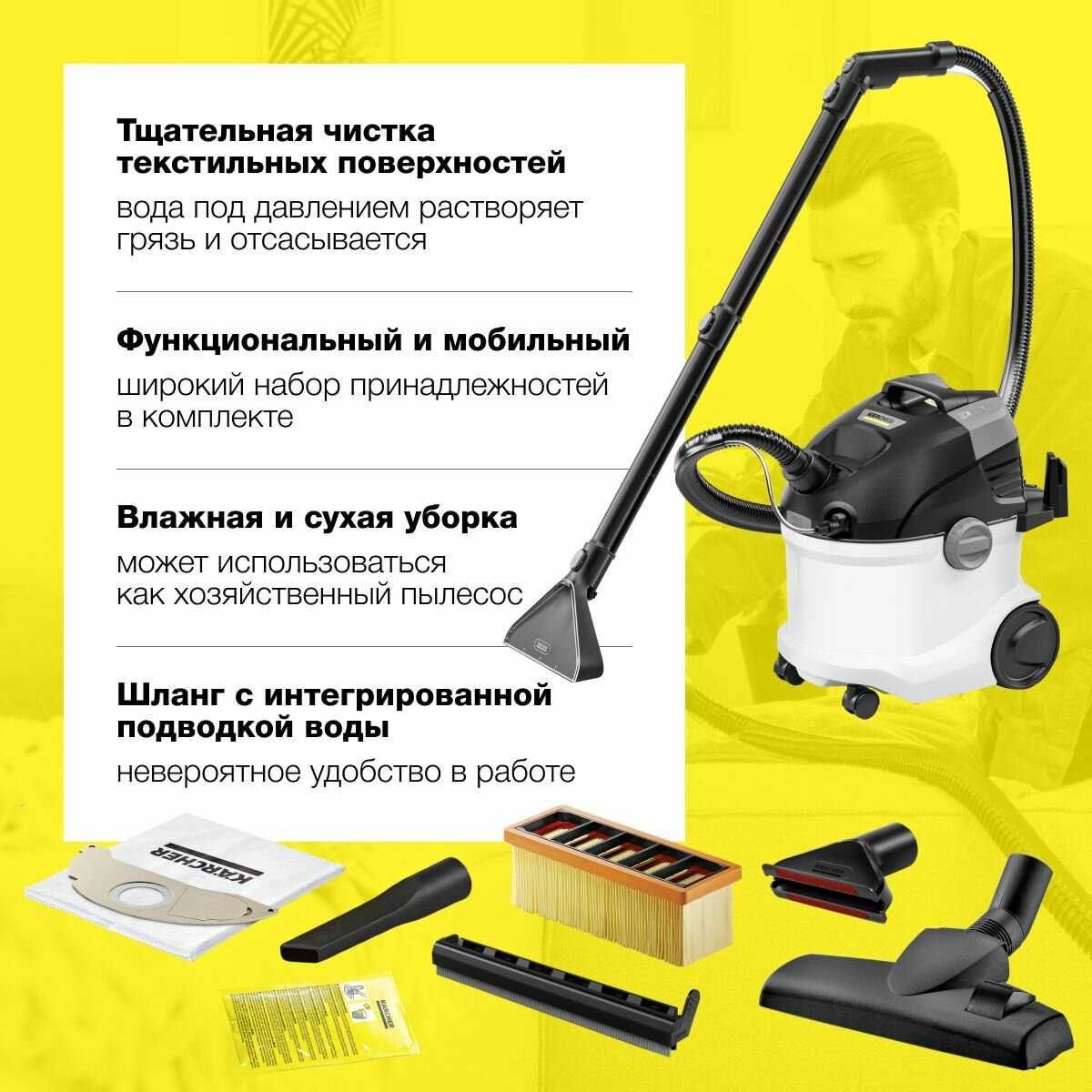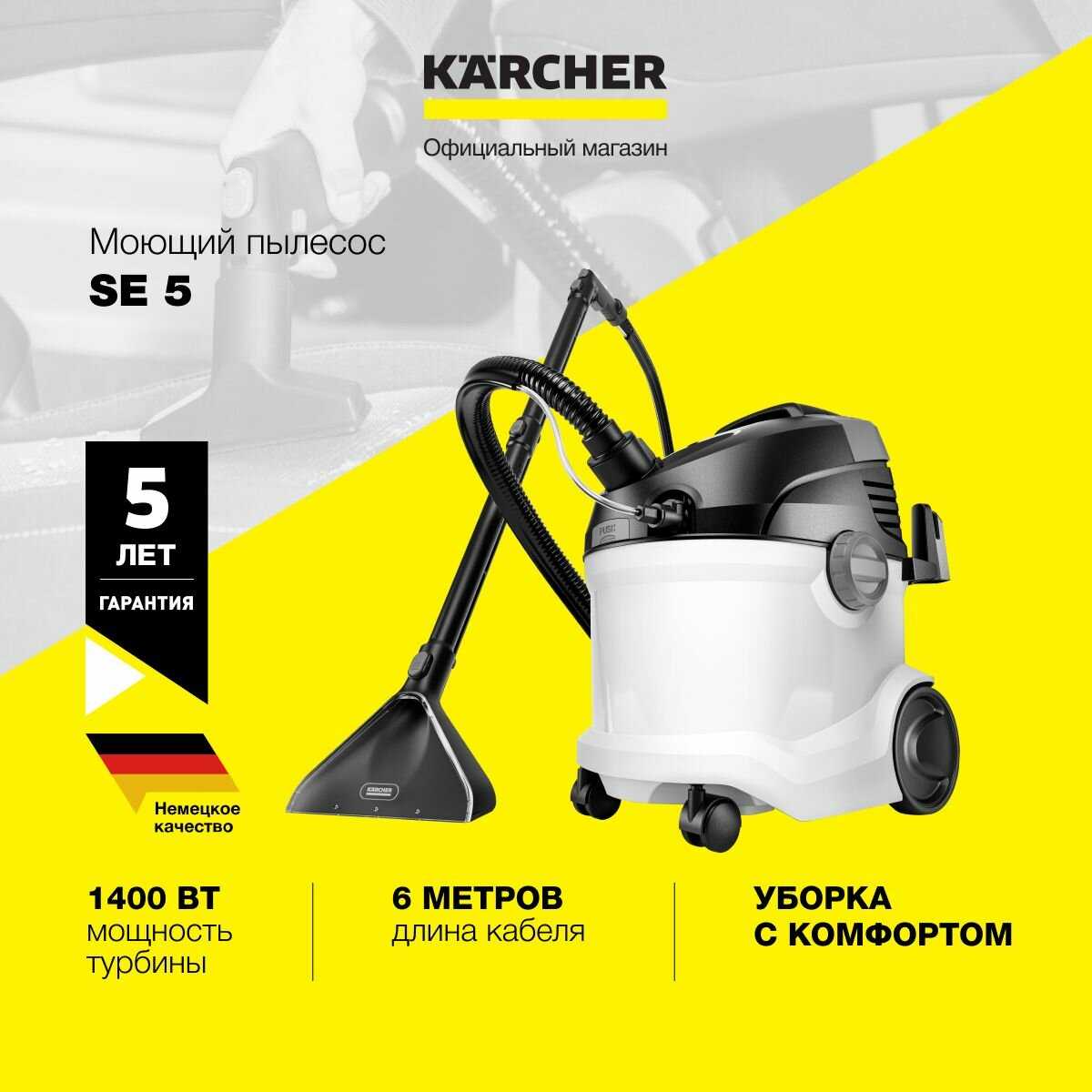 - Совместимость с химией Karcher, такой как RM 519, усиливает удаление запахов и аллергенов от шерсти животных, улучшая качество воздуха в домах с питомцами и детьми.