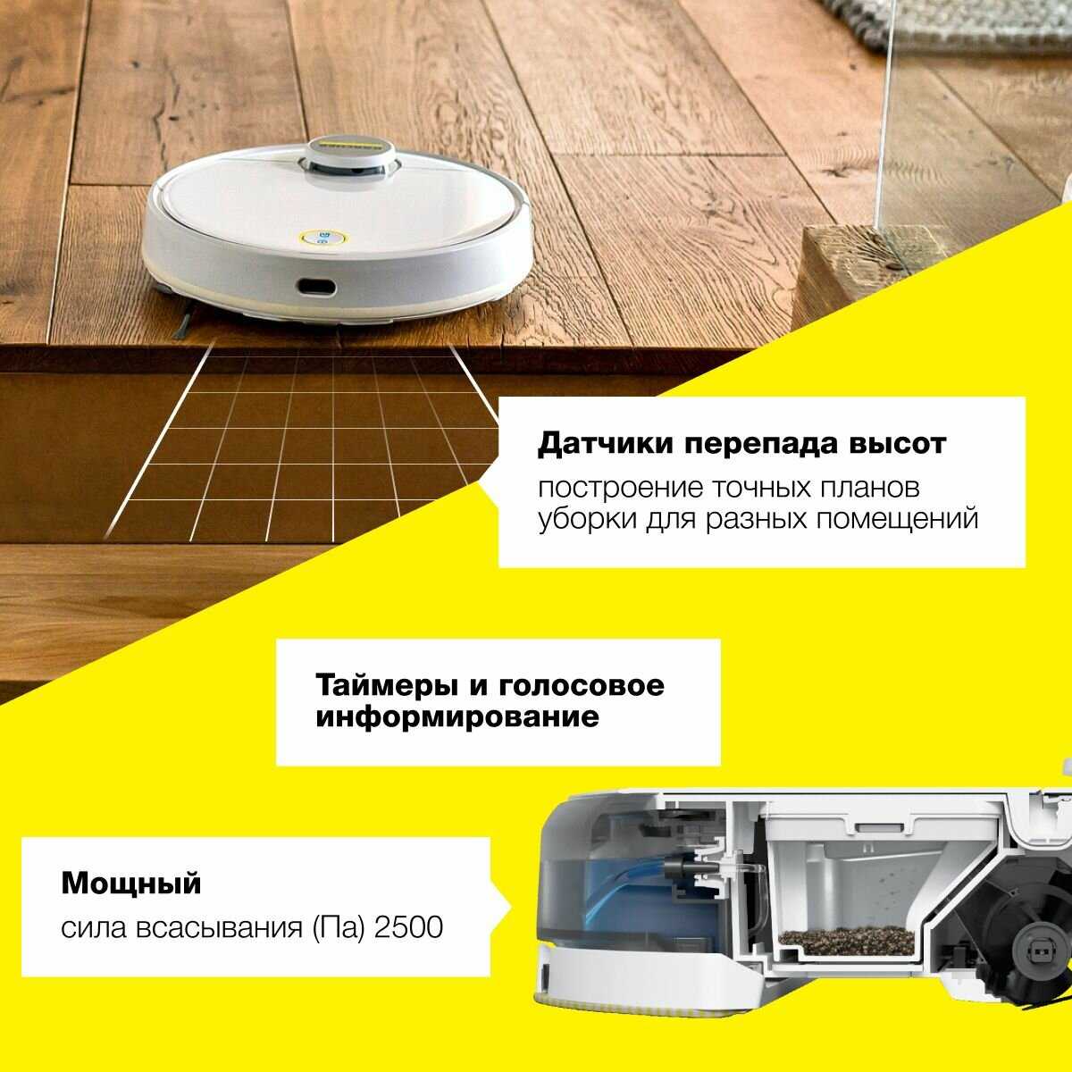 - Автоматическое определение ковровых покрытий и отключение мойки в этих зонах.