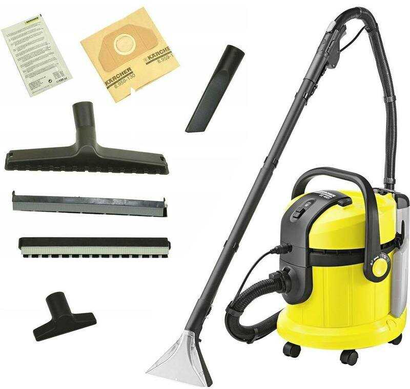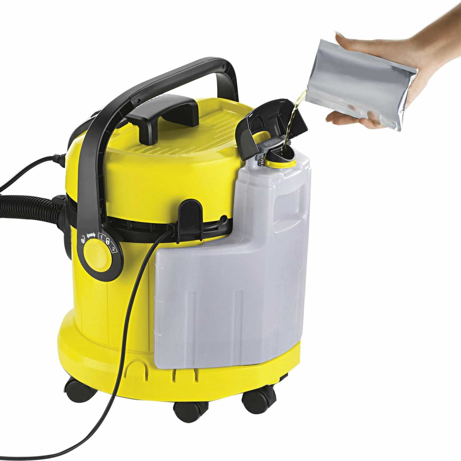 Для химчистки мебели требуется докупать специальную насадку, отсутствующую в базовой комплектации SE 4001. При её наличии пылесос отлично удаляет загрязнения с обивки, что подтверждается видимыми результатами "до/после". Однако пользователи рекомендуют предварительно наносить пену губкой, а затем всасывать излишки, так как прямая подача раствора через шланг может быть избыточной. -