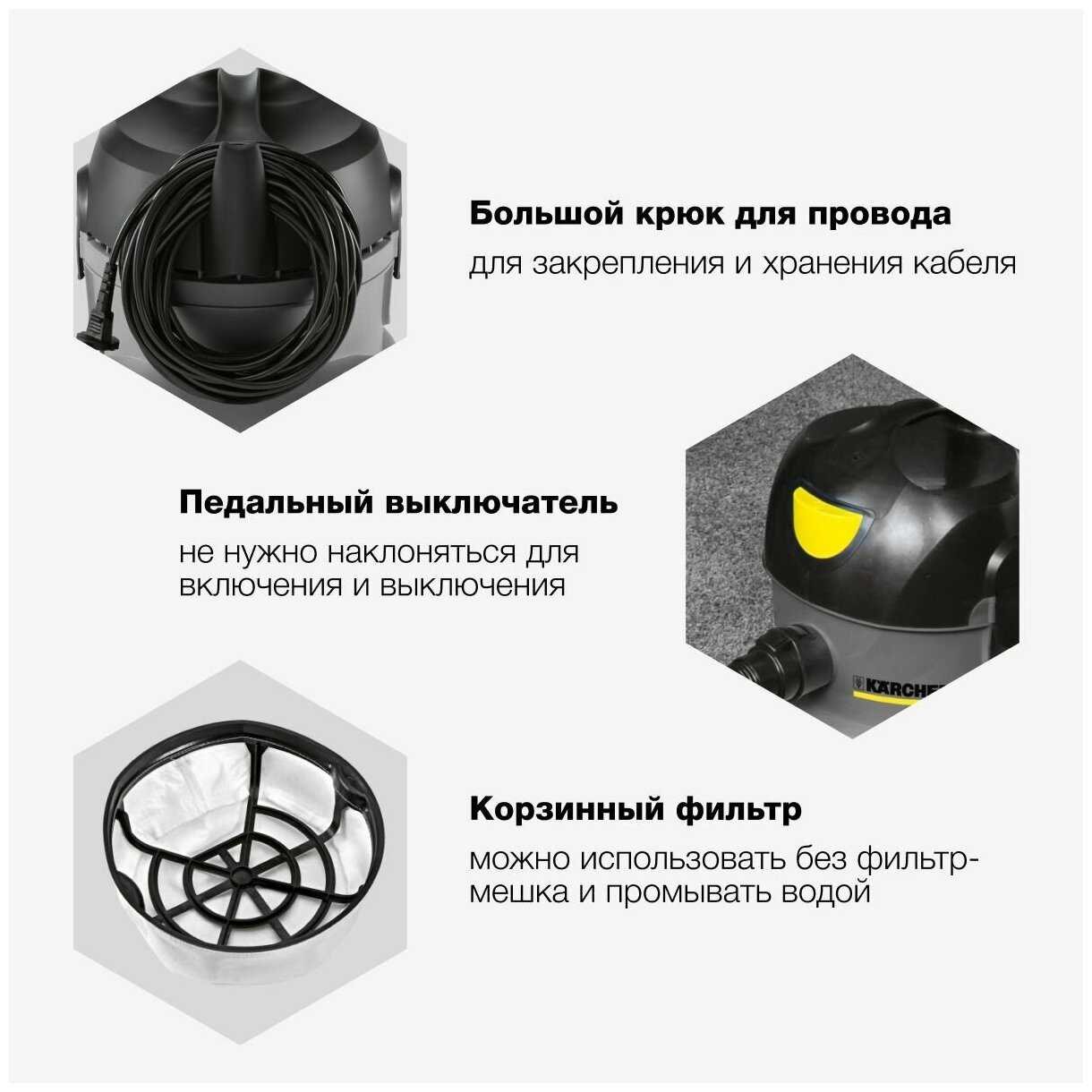 - + Пылесос для сухой уборки идеален для профессиональной уборки и разработан в сотрудничестве со специалистами клининга. Хозяйственный пылесос Karcher с мусоросборником на 8 литров.