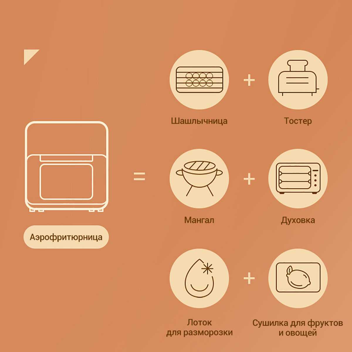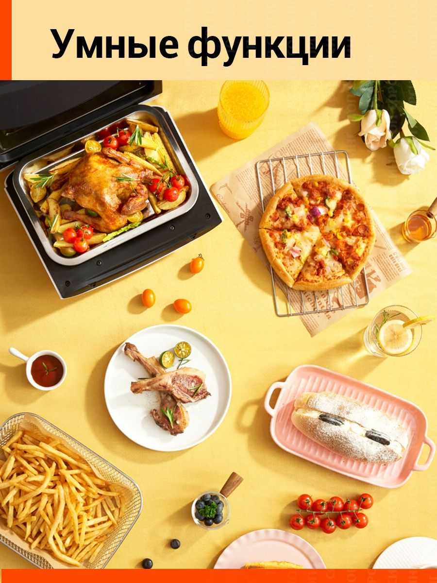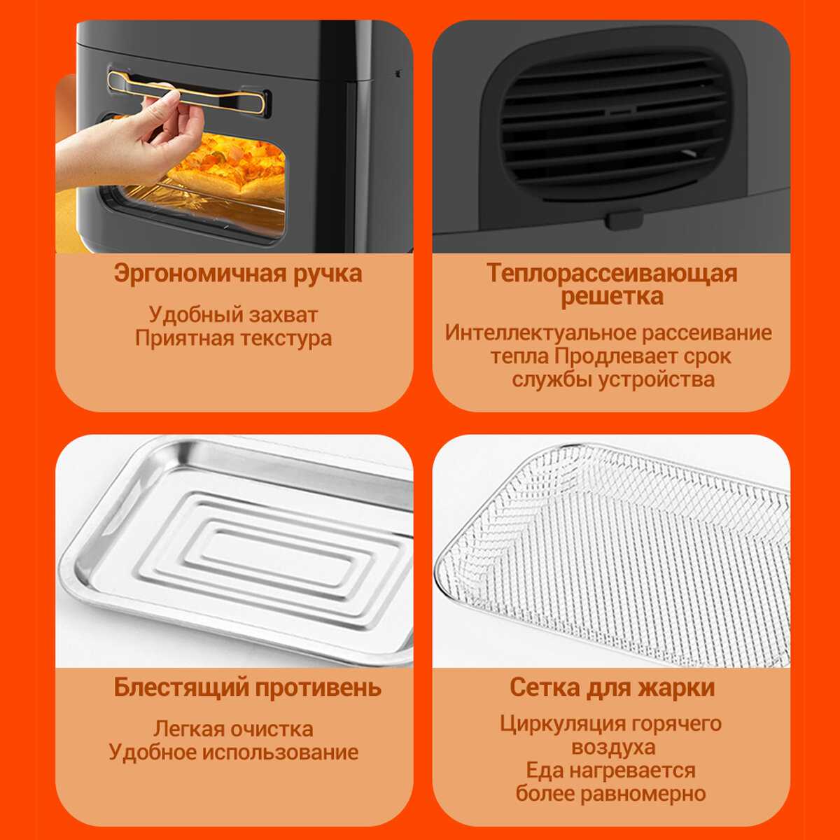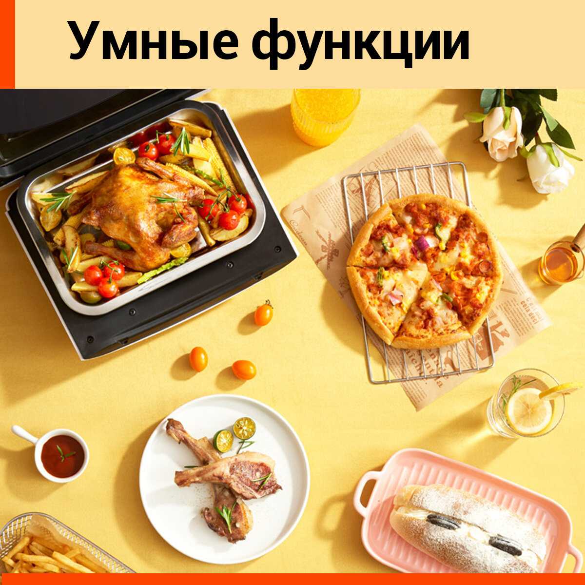- Возможность использовать устройство в качестве аэрогриля, мини-духовки и тостера для приготовления широкого спектра блюд: от выпечки и пиццы до жарки мяса и овощей.