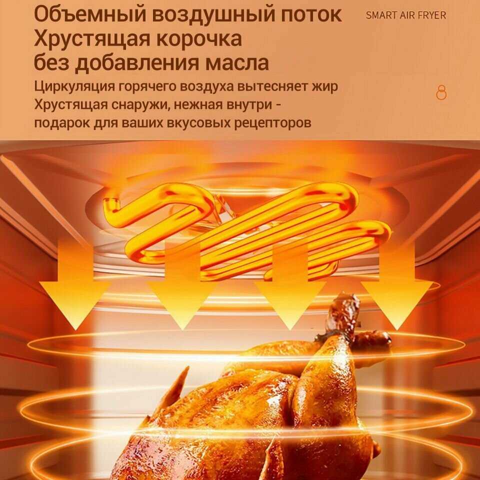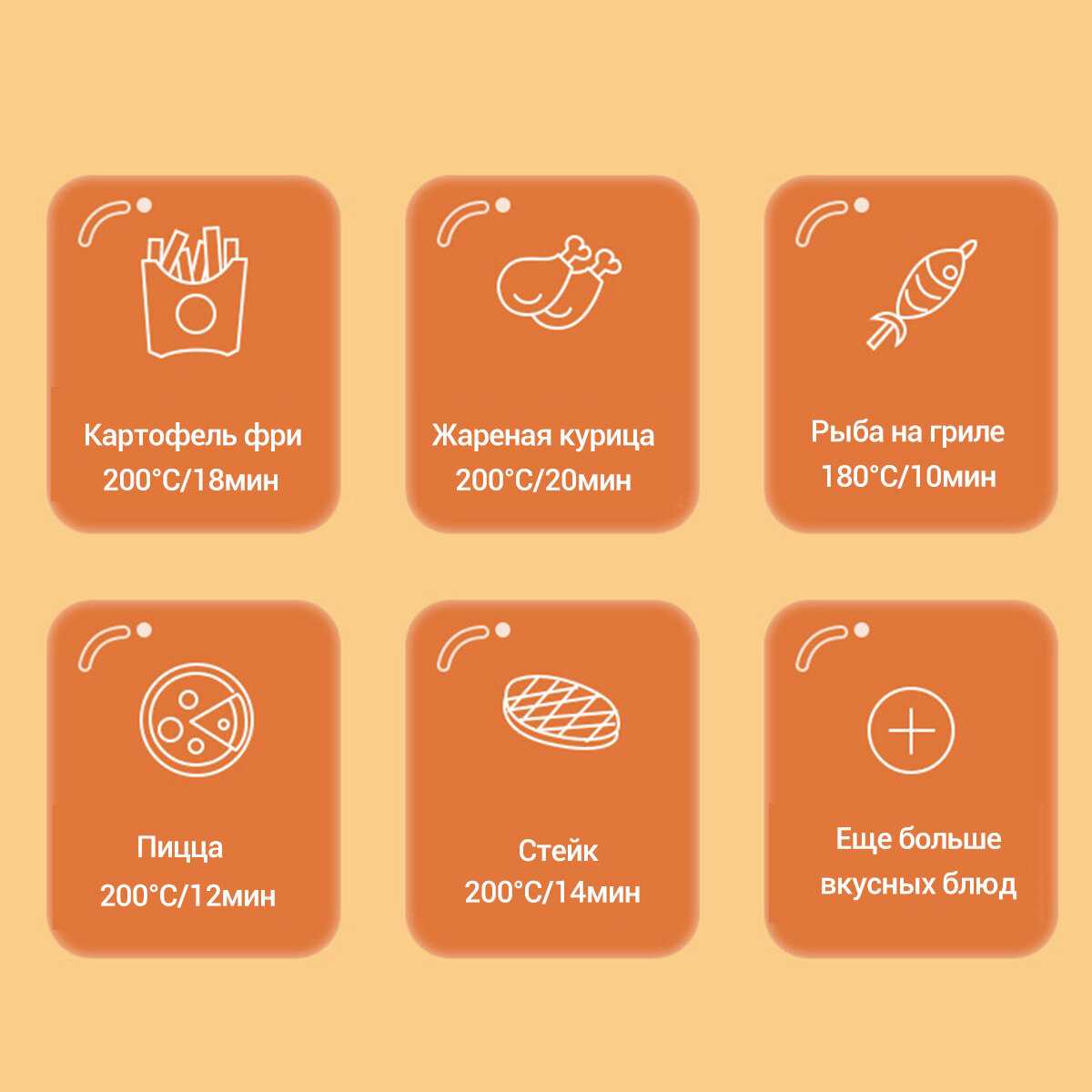 Максимальная температура нагрева составляет 210 градусов. Время приготовления варьируется в зависимости от блюда и его количества. Например, куриные голени или котлеты готовятся относительно быстро — за 20-30 минут. В то же время картофель фри, по отзывам, может готовиться до 40 минут и при этом рискует подгореть сверху, если не подобрать правильный режим, что требует от пользователя некоторого опыта и экспериментов. -