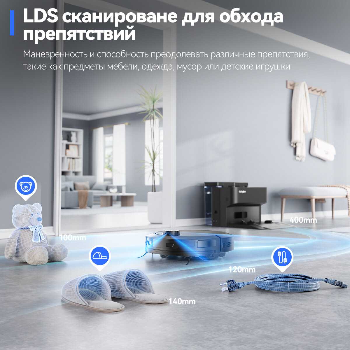 - Быстро и точно строит карту помещения, позволяя ориентироваться в пространстве и эффективно планировать маршрут уборки, избегая хаотичных движений.