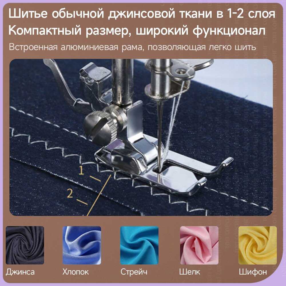 Ключевые ограничения: минимальный отступ от края ткани (2 см), иначе возможен сбой; сложность с прошиванием более двух слоёв плотной ткани (например, джинсы в 4 слоя); зависимость от качества игл — комплектные быстро тупятся. Также длина шнура педали (148 см) может быть неудобна для высоких столов, а мощность мотора (6 В) не рассчитана на интенсивные нагрузки. -