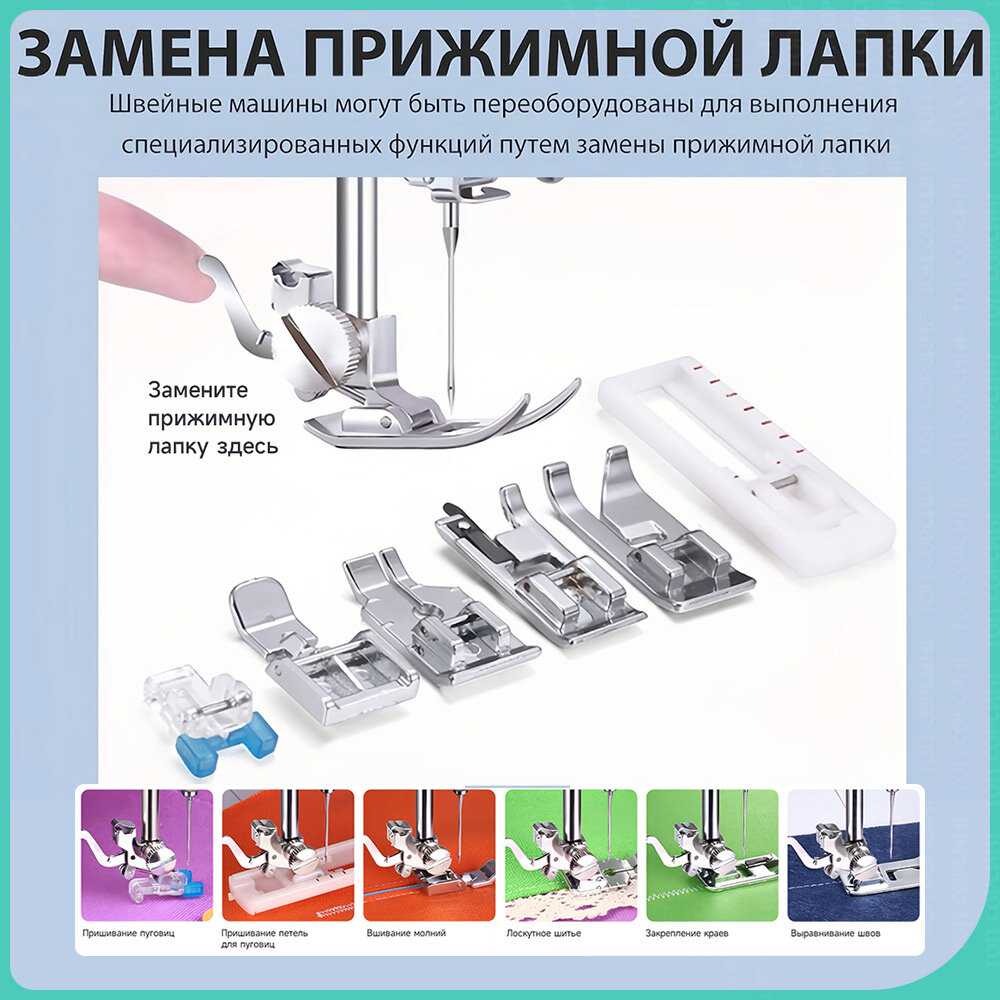 - Регулируемая высота подъема лапки адаптируется к толщине материала или многослойным швам.