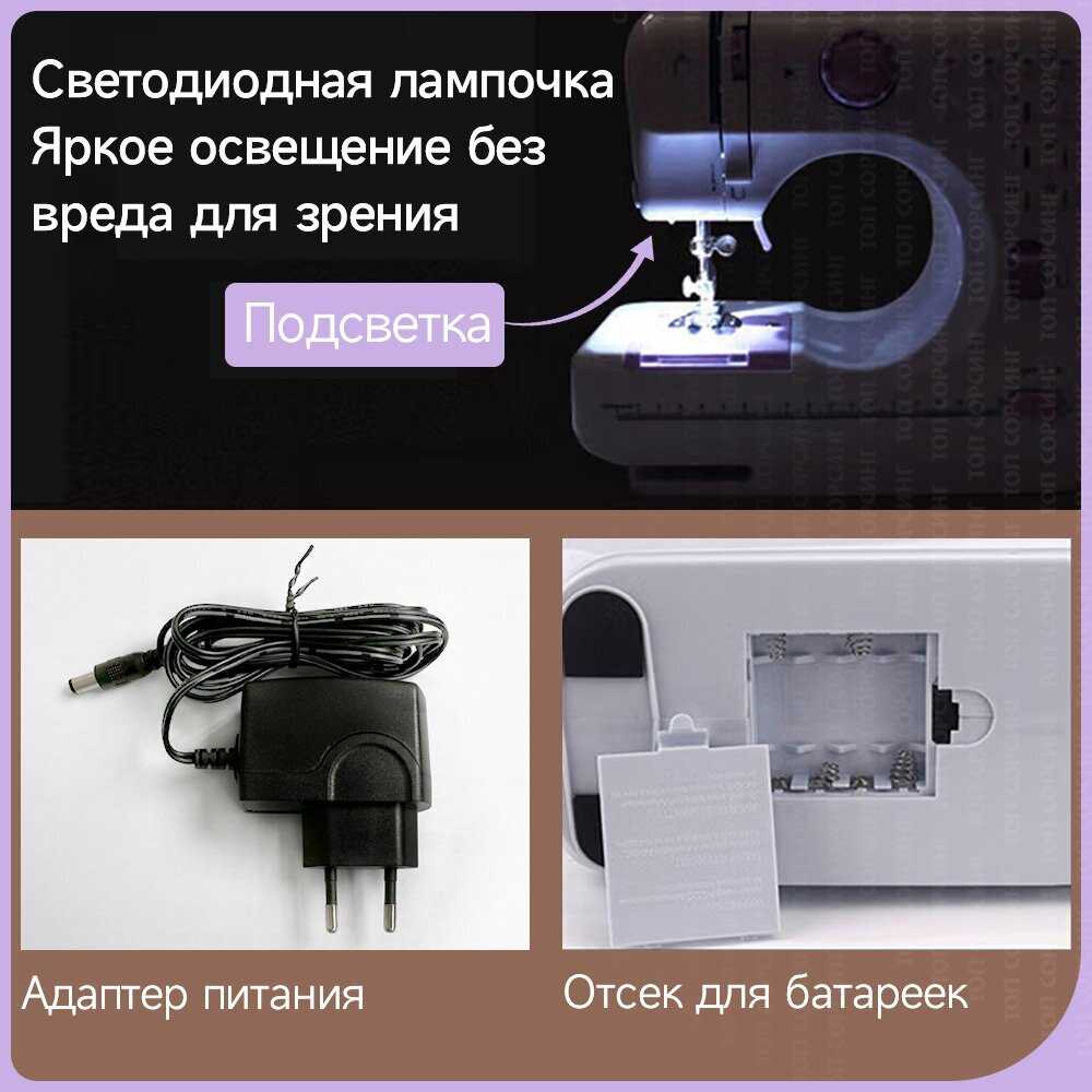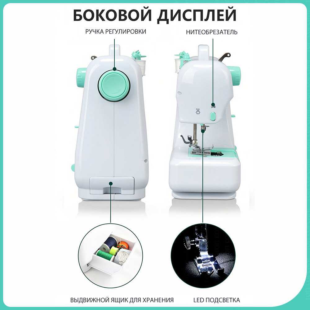 Компактный размер (примерно 25х15 см) и встроенная ручка для переноски делают её мобильной — пользователи берут её в поездки или хранят в шкафу. Вес около 1.5–2 кг обеспечивает устойчивость на столе без скольжения. Для тех, кто часто перемещается, это оптимальный вариант, особенно с поддержкой работы от батареек, что позволяет шить даже вне дома.