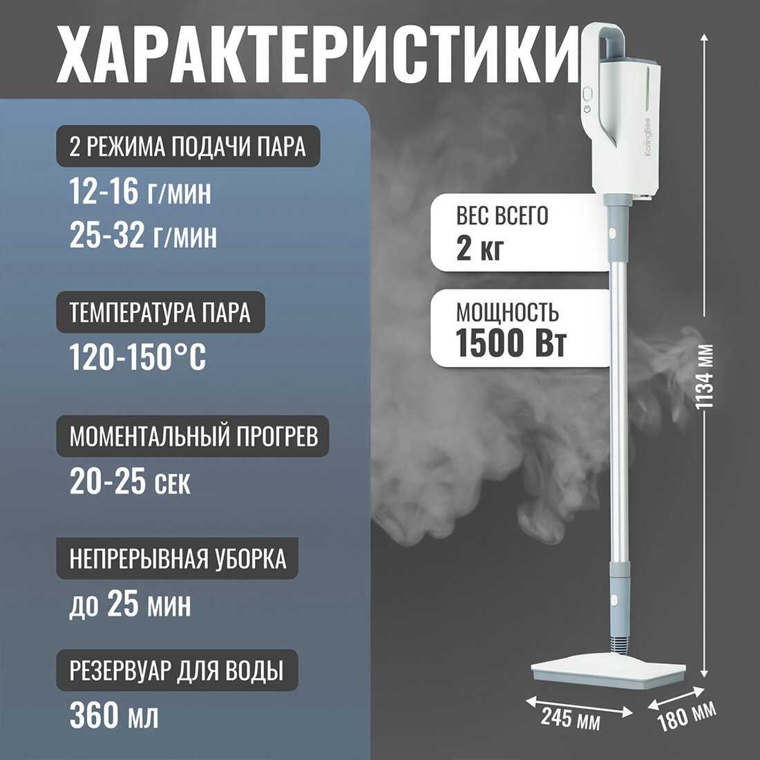 Отличная вещь. Очень рада, что приобрела. У нас линолеум ребристый, и там скапливается грязь. Использовала насадку-щетку, и всё отлично очистилось. Я немного приноровилась, и дело пошло очень быстро. Ещё отлично справляется с жиром на кухне.Есть насадка для отпаривания вещей. Тоже отлично справляется. Хлопок быстро разгладила, а лен чуть сложнее, но за такую цену вообще претензий нет.