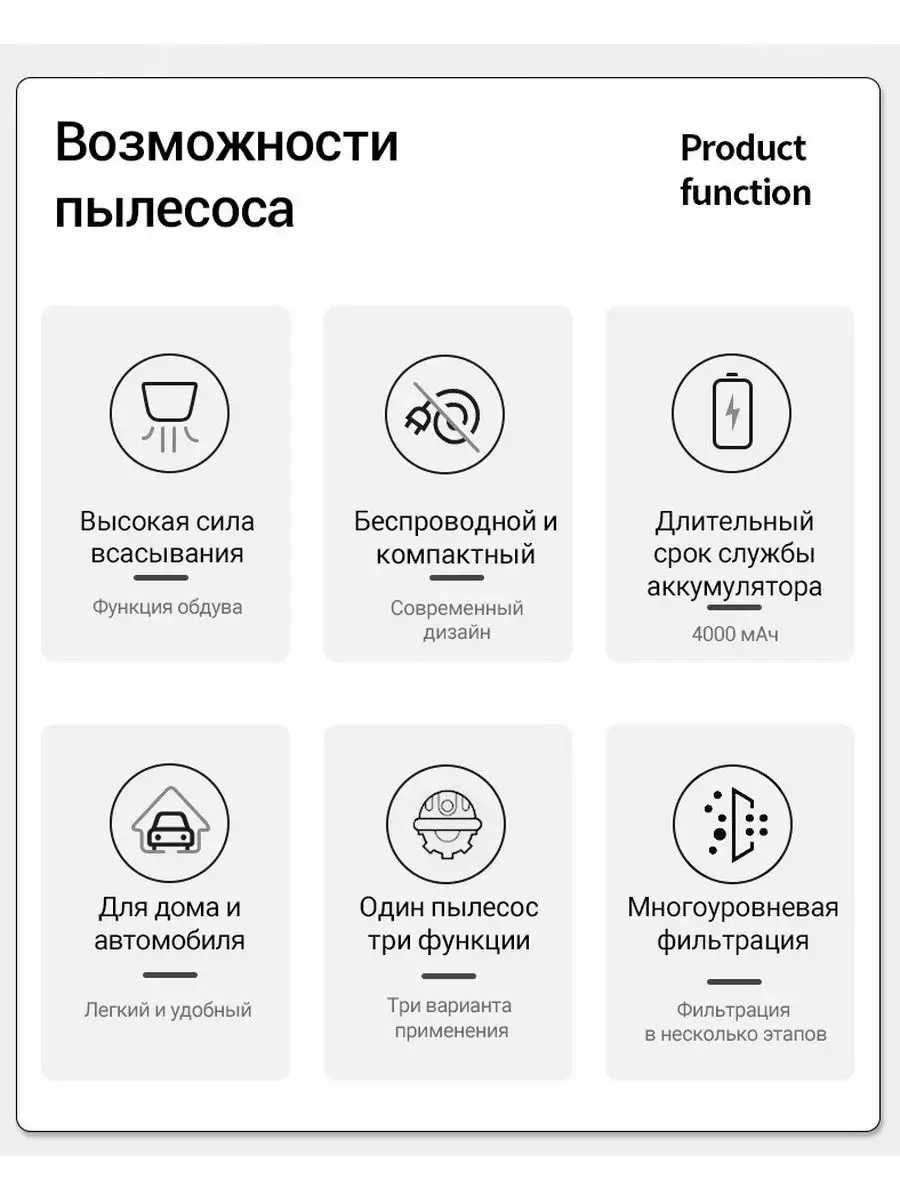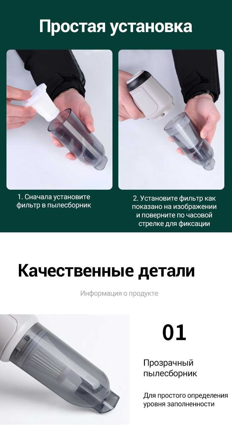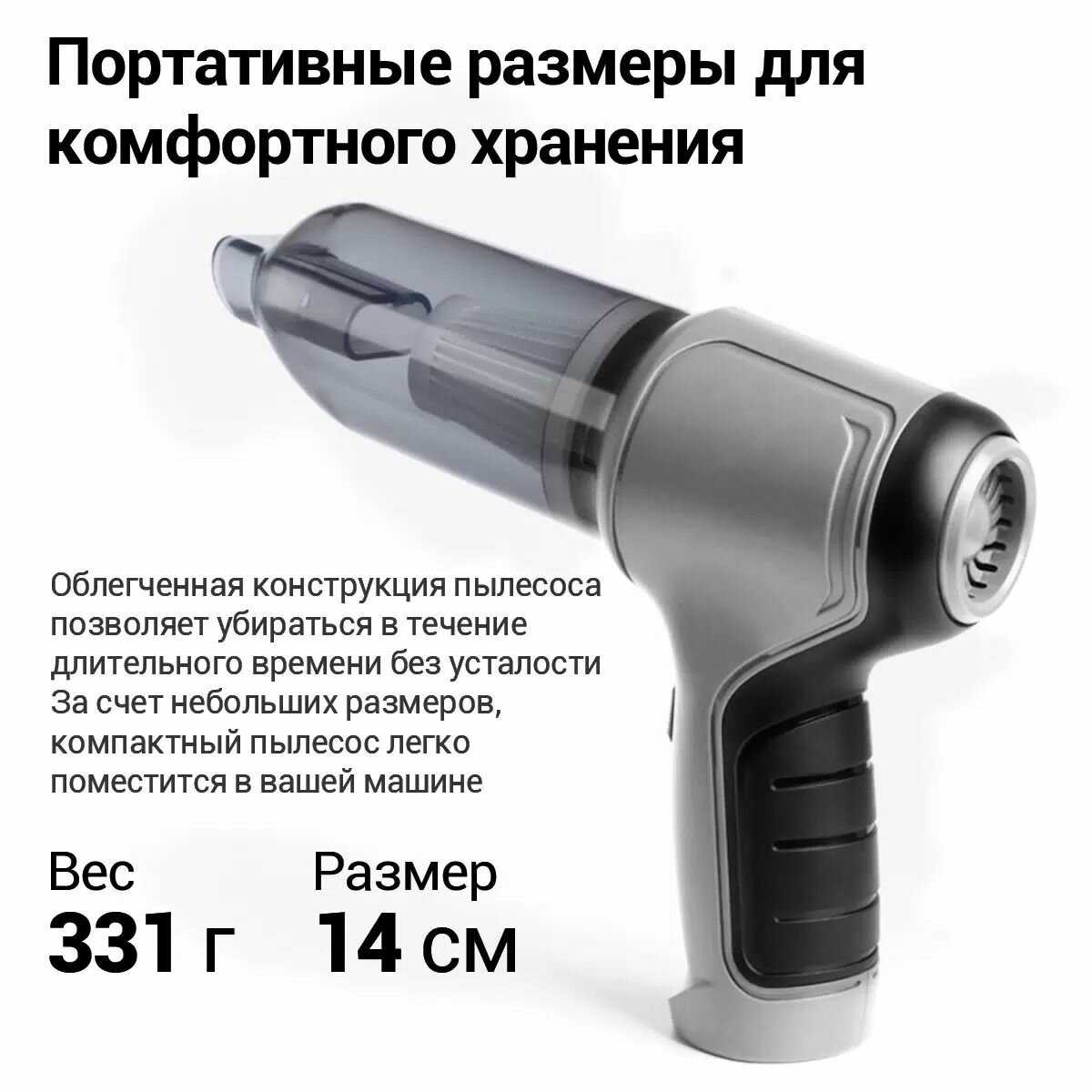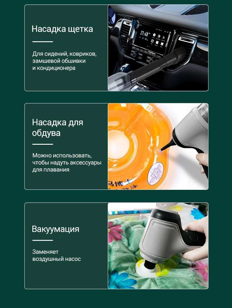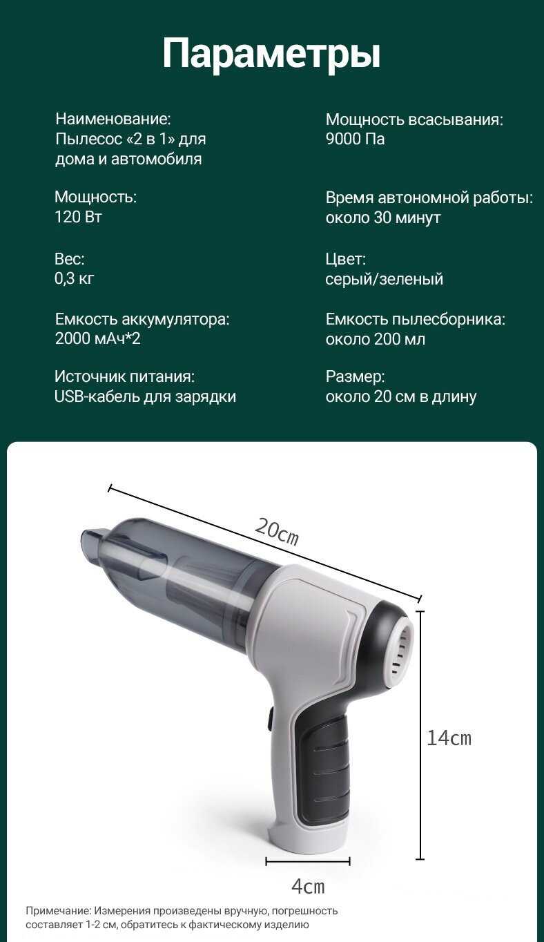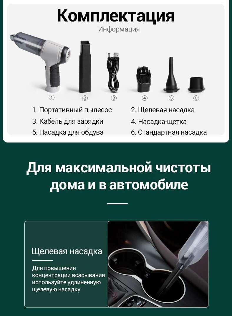 - - Этой мизерной игрушкой только углы освежить, ни о какой уборке авто и речи быть не может. Насадки узкие и маленькие все. Никакого коэффициента полезного действия. На картинке выглядит больше, чем в реальности. не ведитесь на это. своих денег не стоит.