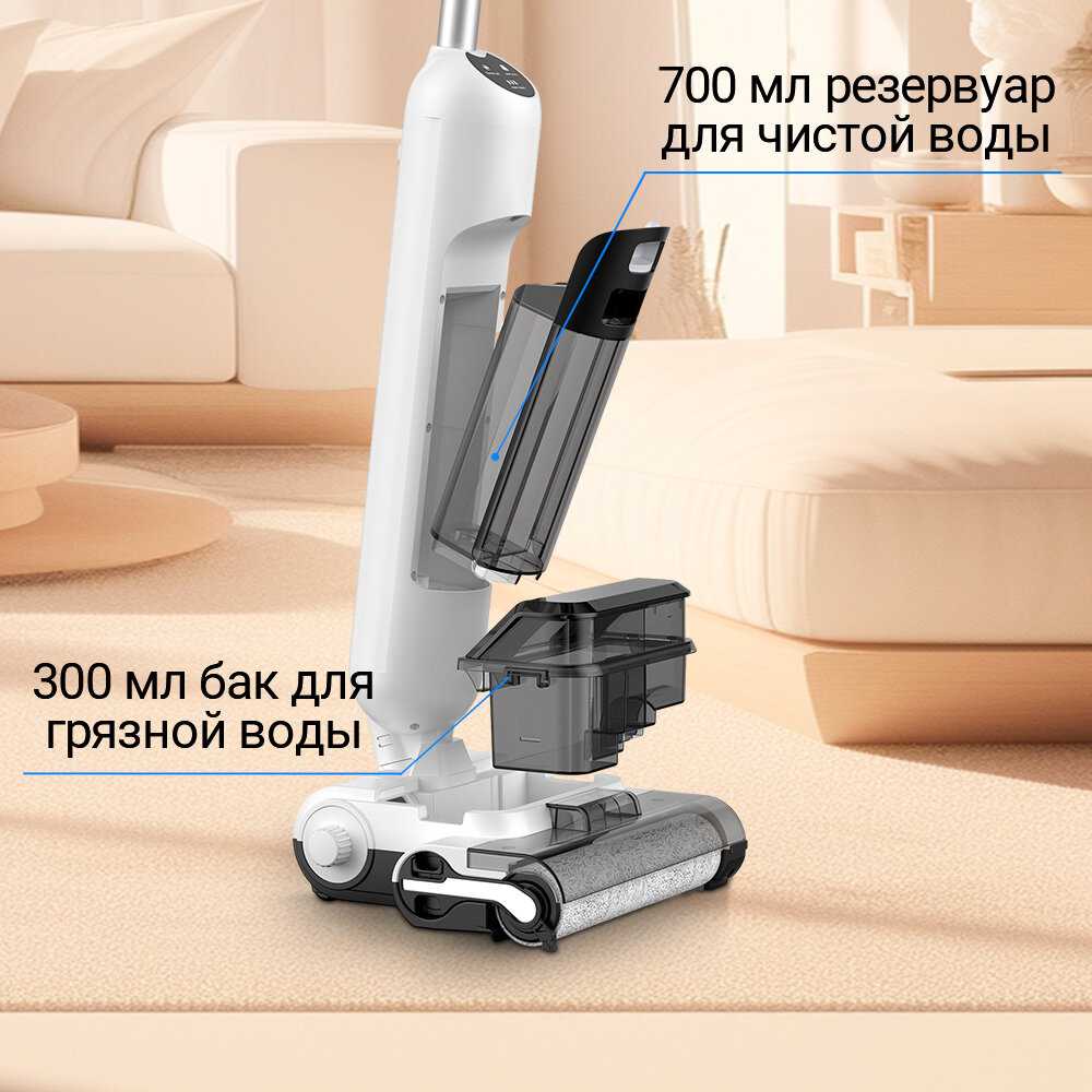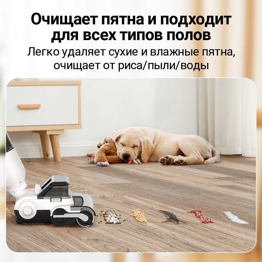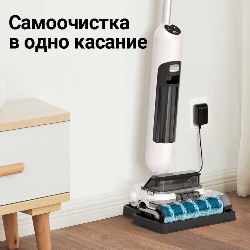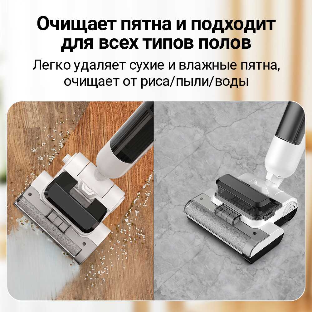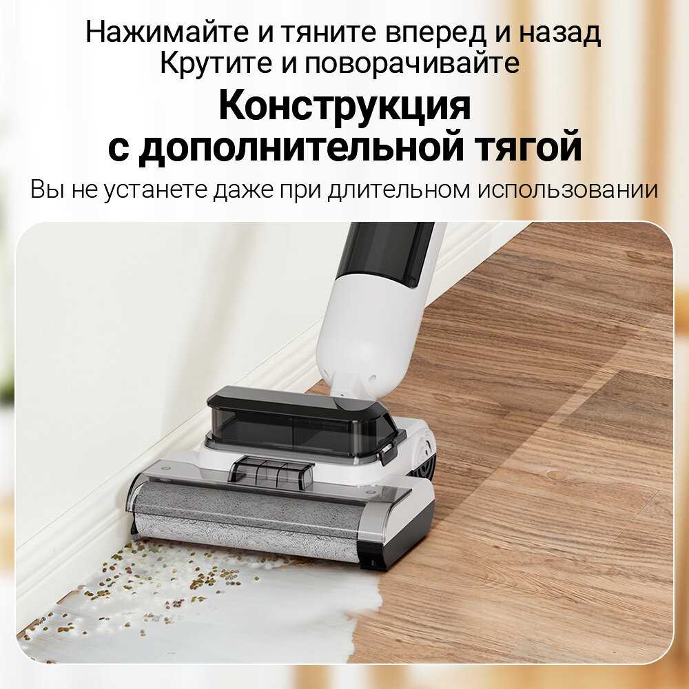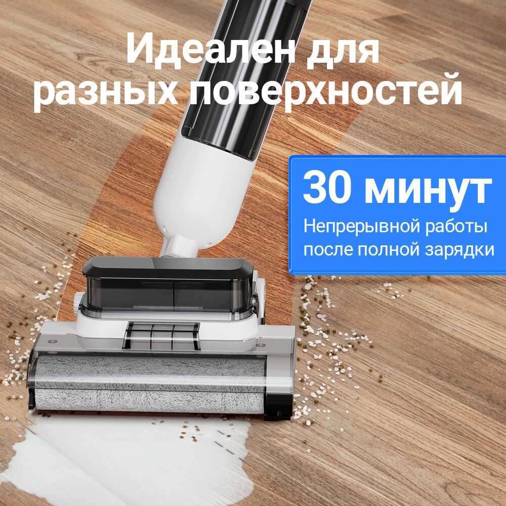 - Комбинированная функция пылесоса и мойки сокращает время на обработку пола до 10–15 минут ежедневно.