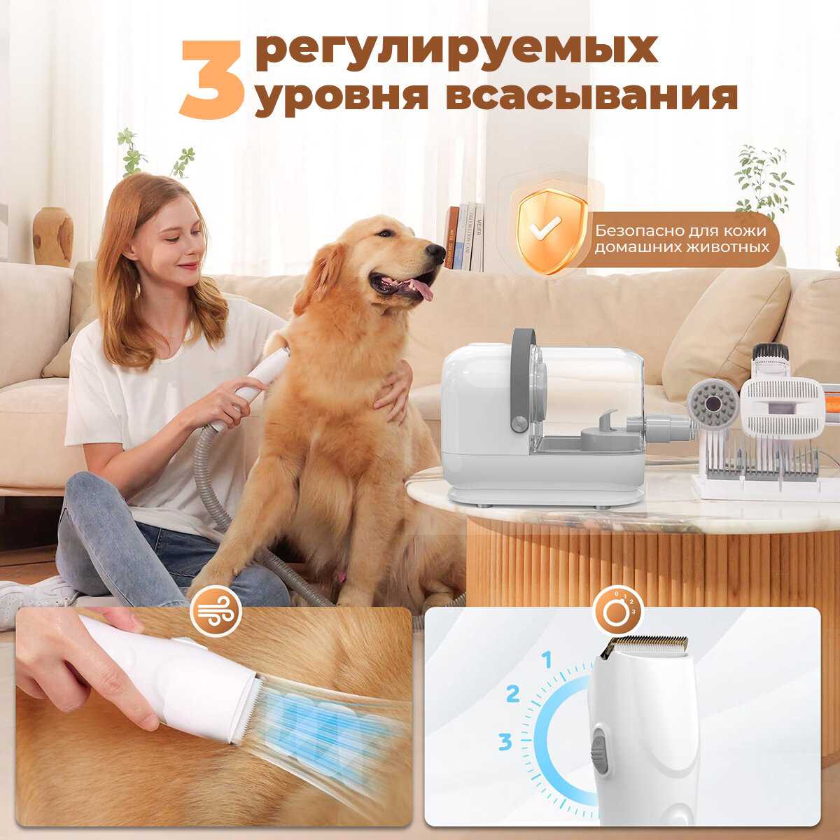 - + Лучшее, что может быть для ухода за животными. Брали для корги и кошки, за 10 минут собирается почти полная колба. В комплекте есть даже машинка для стрижки, у корги подстриг без проблем лапы от шерсти. Также бесподобен для уборки дивана от шерсти кошки, не пойму как работает эта большая насадка, но она все полностью убирает без следов.