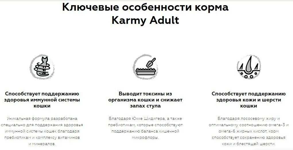 Karmy часто оказывается единственным сухим кормом, который соглашаются есть разборчивые питомцы. Владельцы капризных кошек отмечают, что те начинают есть его сразу, без длительного привыкания, и едят с постоянным аппетитом. Гранулы имеют натуральный, несильный запах, что, по-видимому, и привлекает животных. Однако важно отметить, что вкусовые предпочтения индивидуальны, и некоторым кошкам может не подойти конкретный вкус. -
