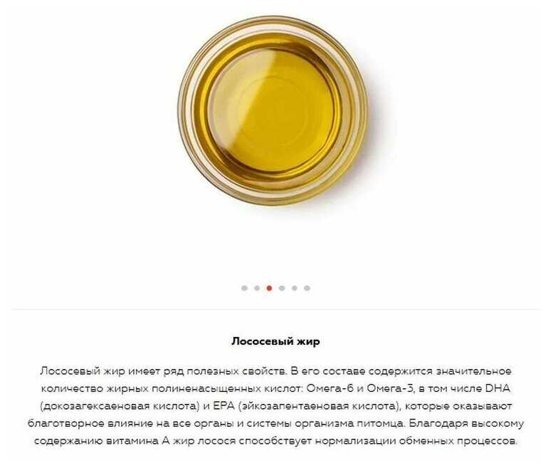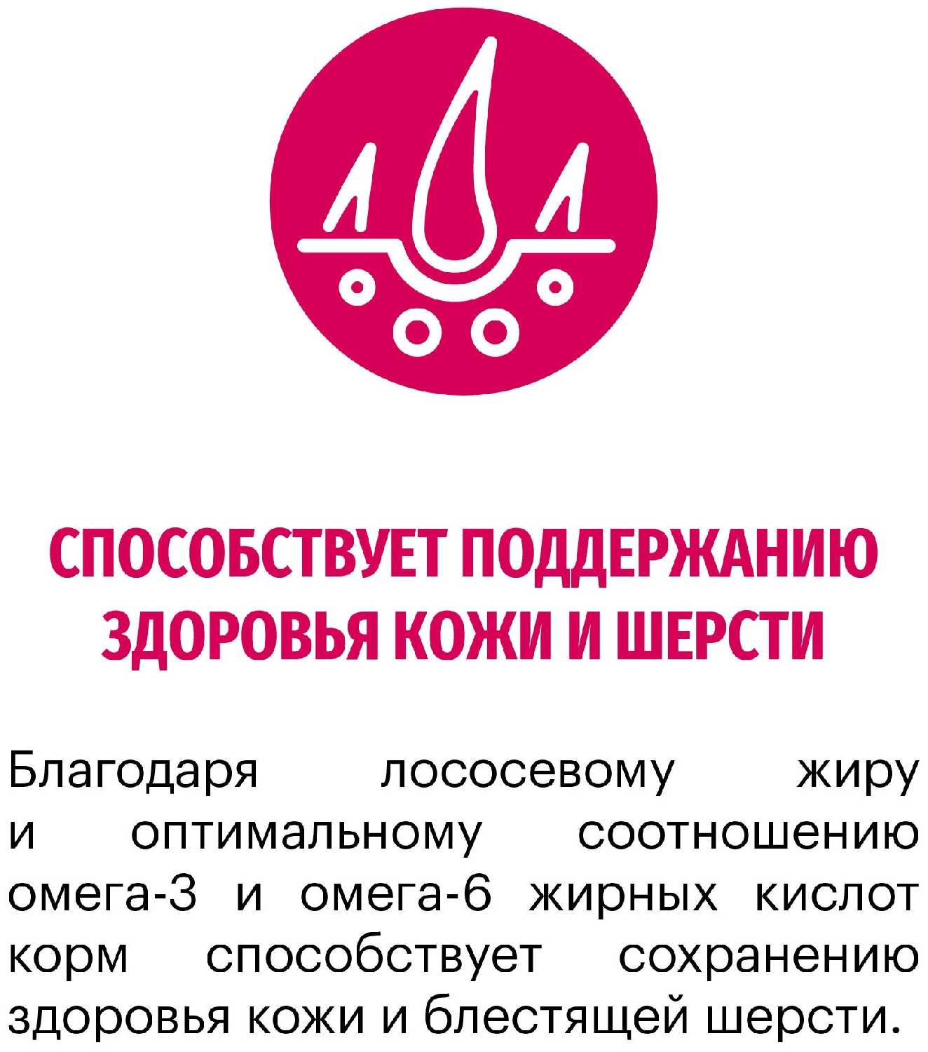 - Добавление жира лосося как источника Омега-жирных кислот способствует здоровью кожи и блеску шерсти.