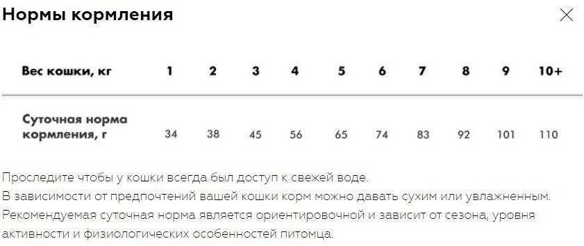 Расход корма является экономичным, так как животные наедаются небольшими порциями. Например, упаковки массой 1.5-2 кг двум кошкам хватает примерно на две недели. Большая 10-килограммовая упаковка для одного животного может закончиться лишь через 3-4 месяца. Норма потребления напрямую зависит от веса, активности и метаболизма питомца, поэтому следует ориентироваться на таблицу на упаковке. -