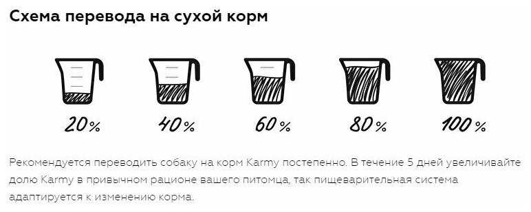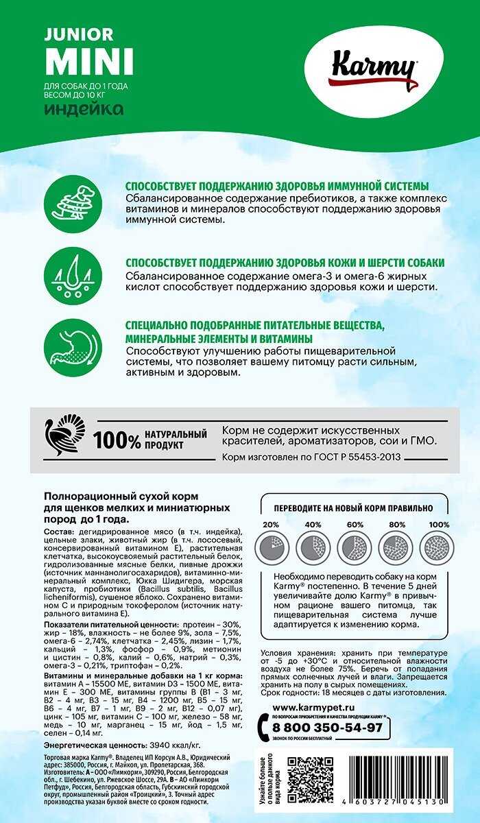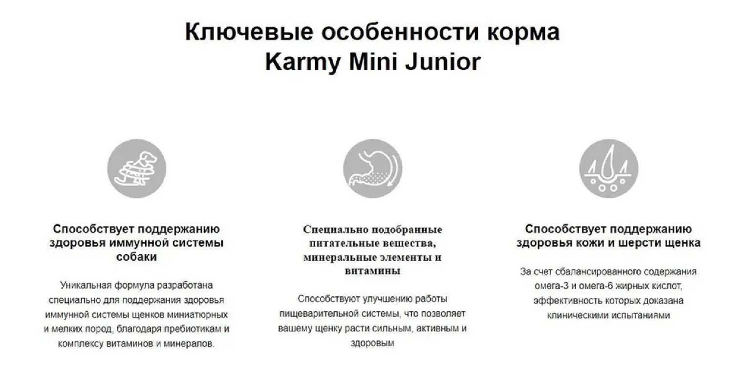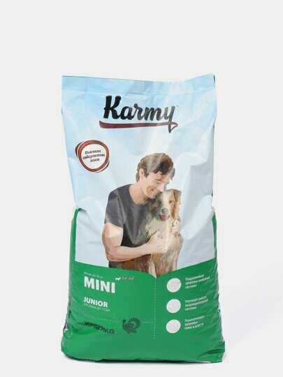 Очень удобная градация кормов, сейчас мой пёс получает полнорационный сухой корм для щенков до 1 года Karmy Mini Junior, после я буду переводить на Karmy Mini Adult.